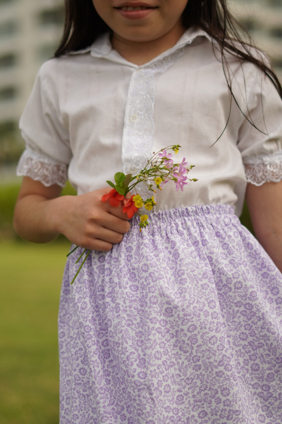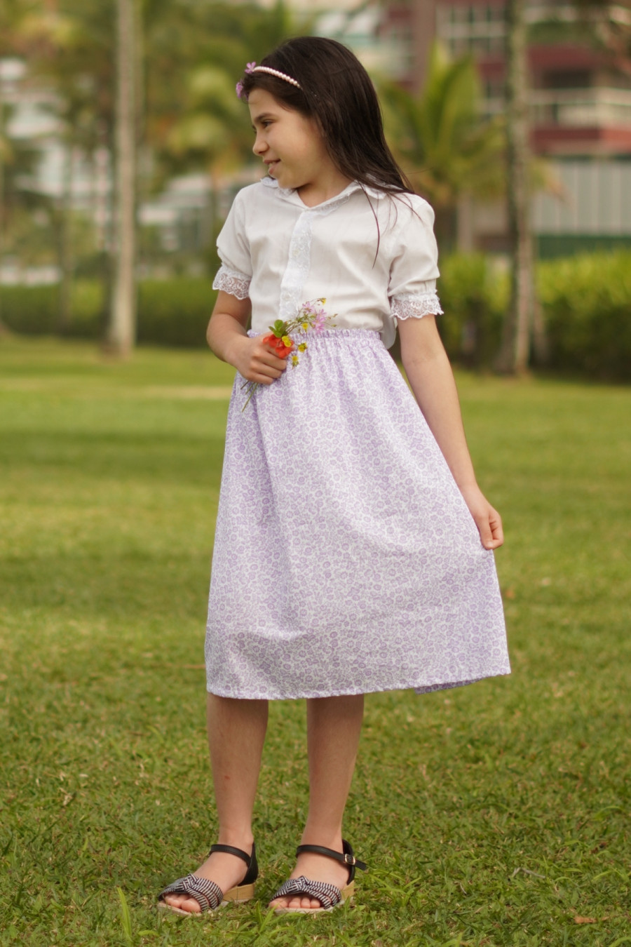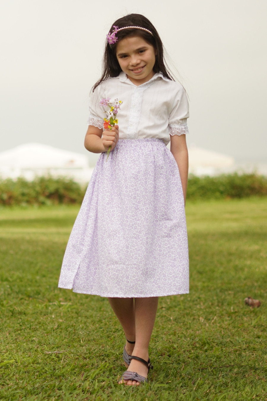 Saia modesta midi infantil franzida, com elástico na cintura confeccionada em tricoline, branca com florzinhas lilás delicadas. Está disponível em tamanhos M e G.