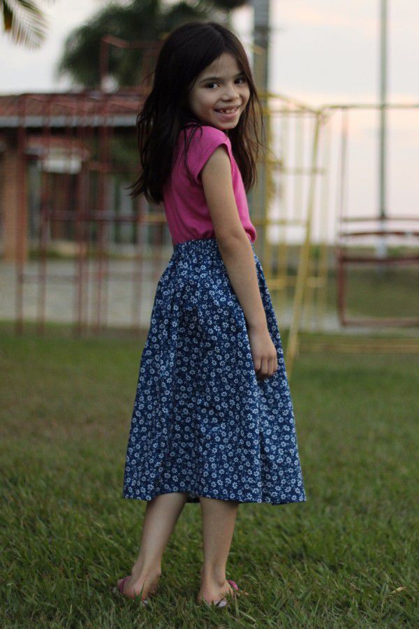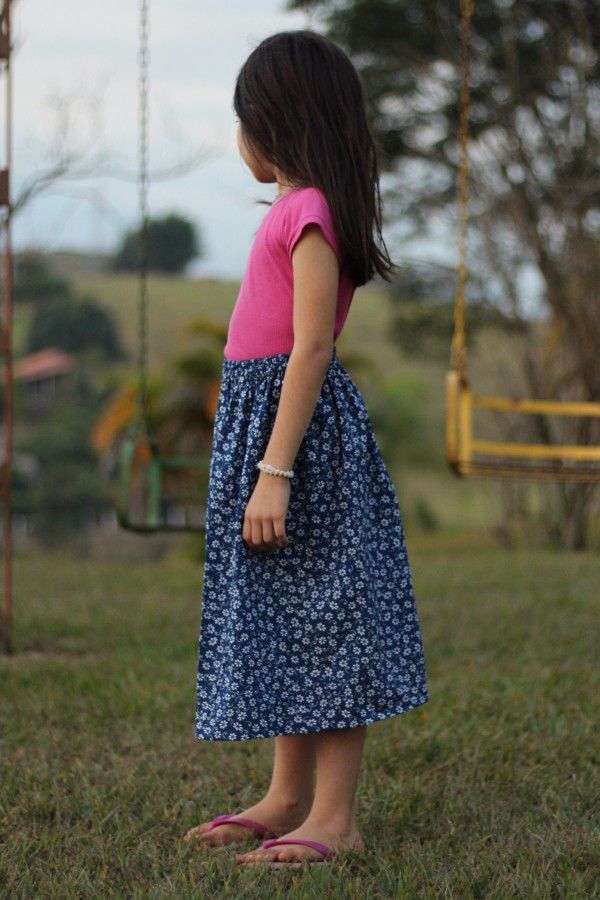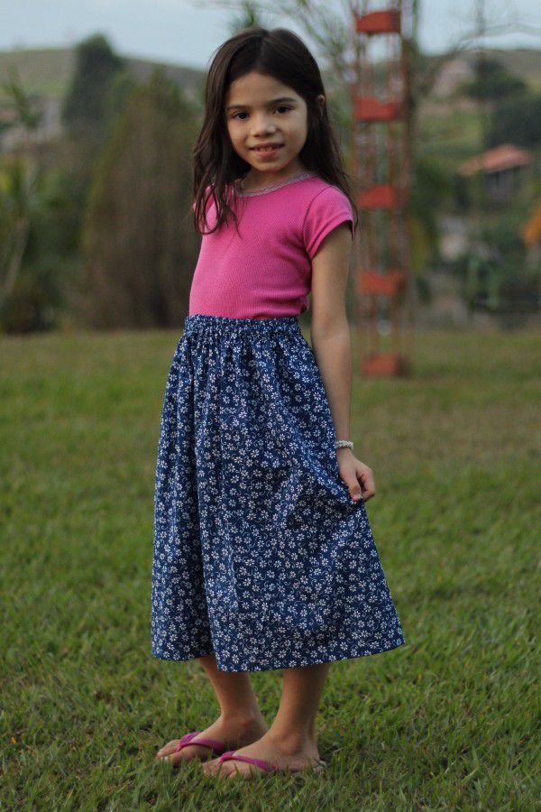 Saia infantil midi franzida azul florzinhas