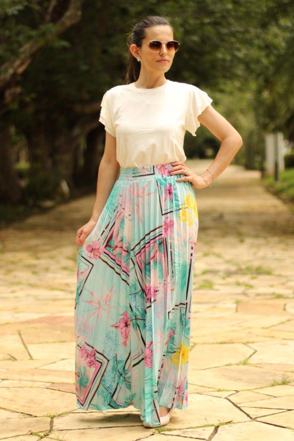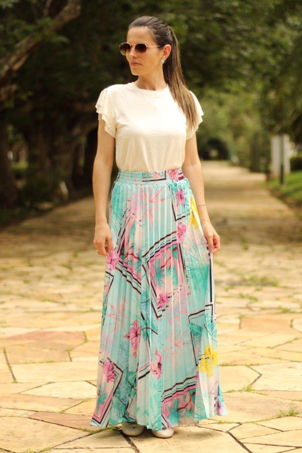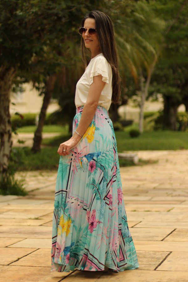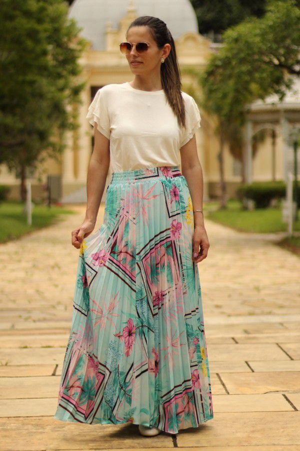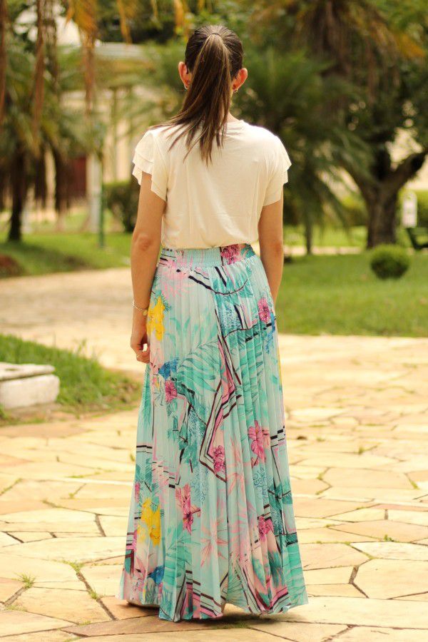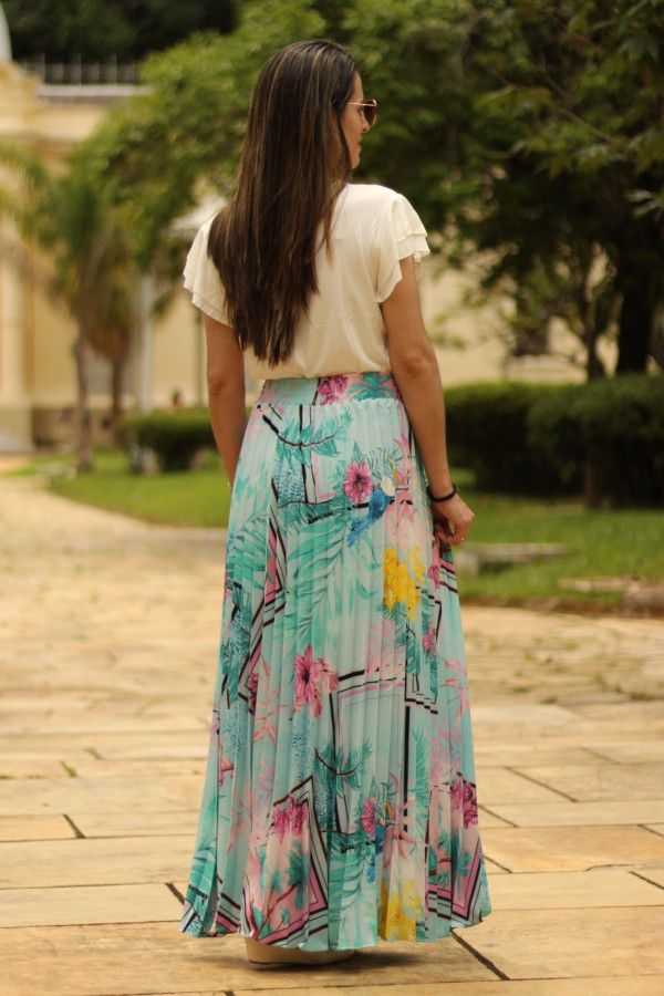 Saia modesta longa plissada, cor azul clara com linda estampa de folhagem. Possui elástico na cintura e está disponível em tamanho único.