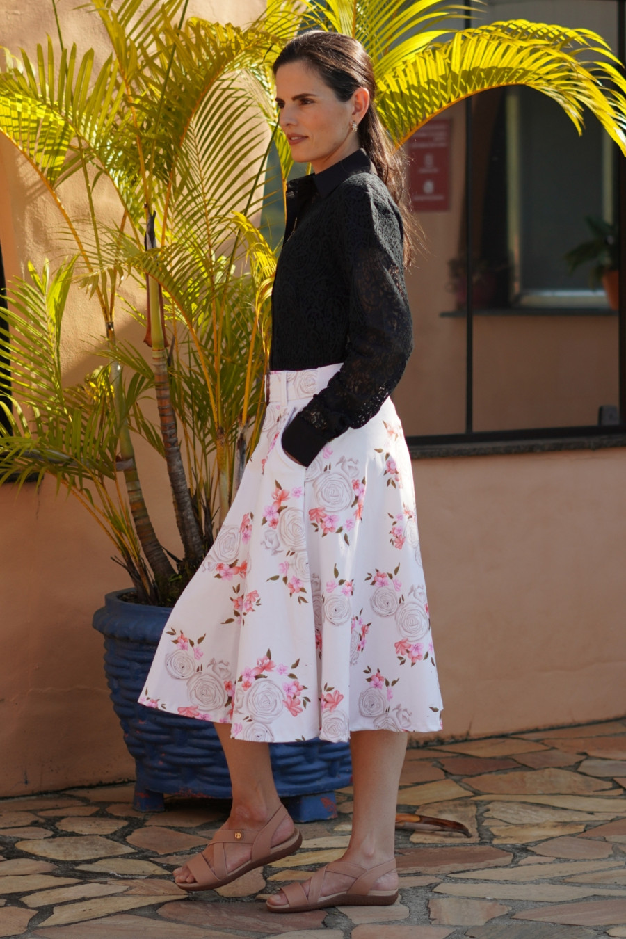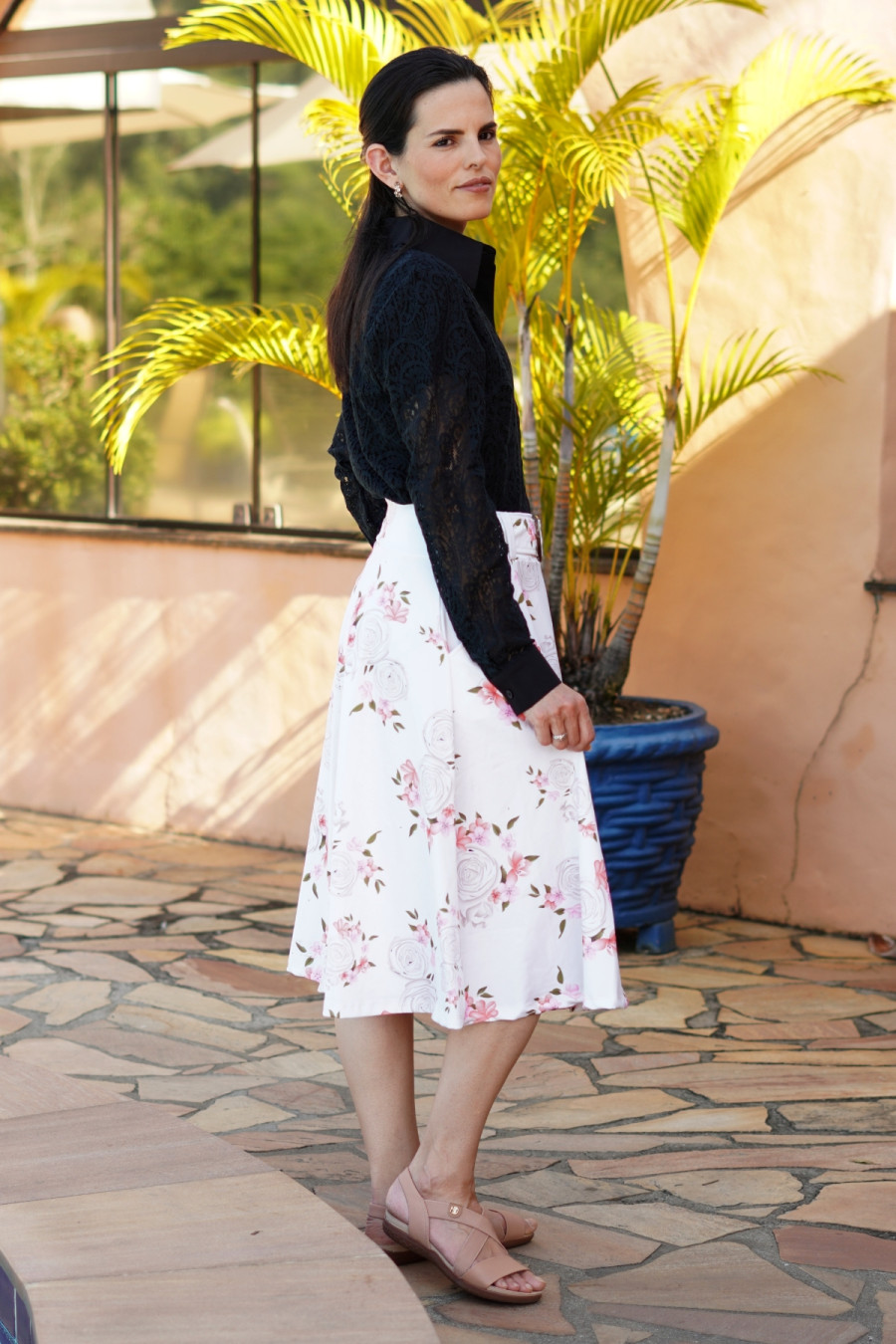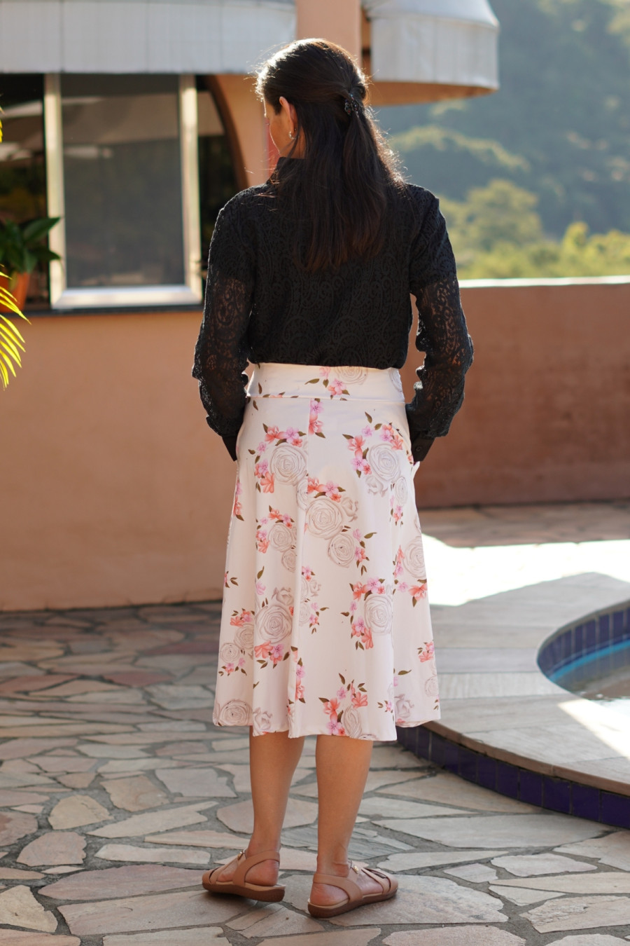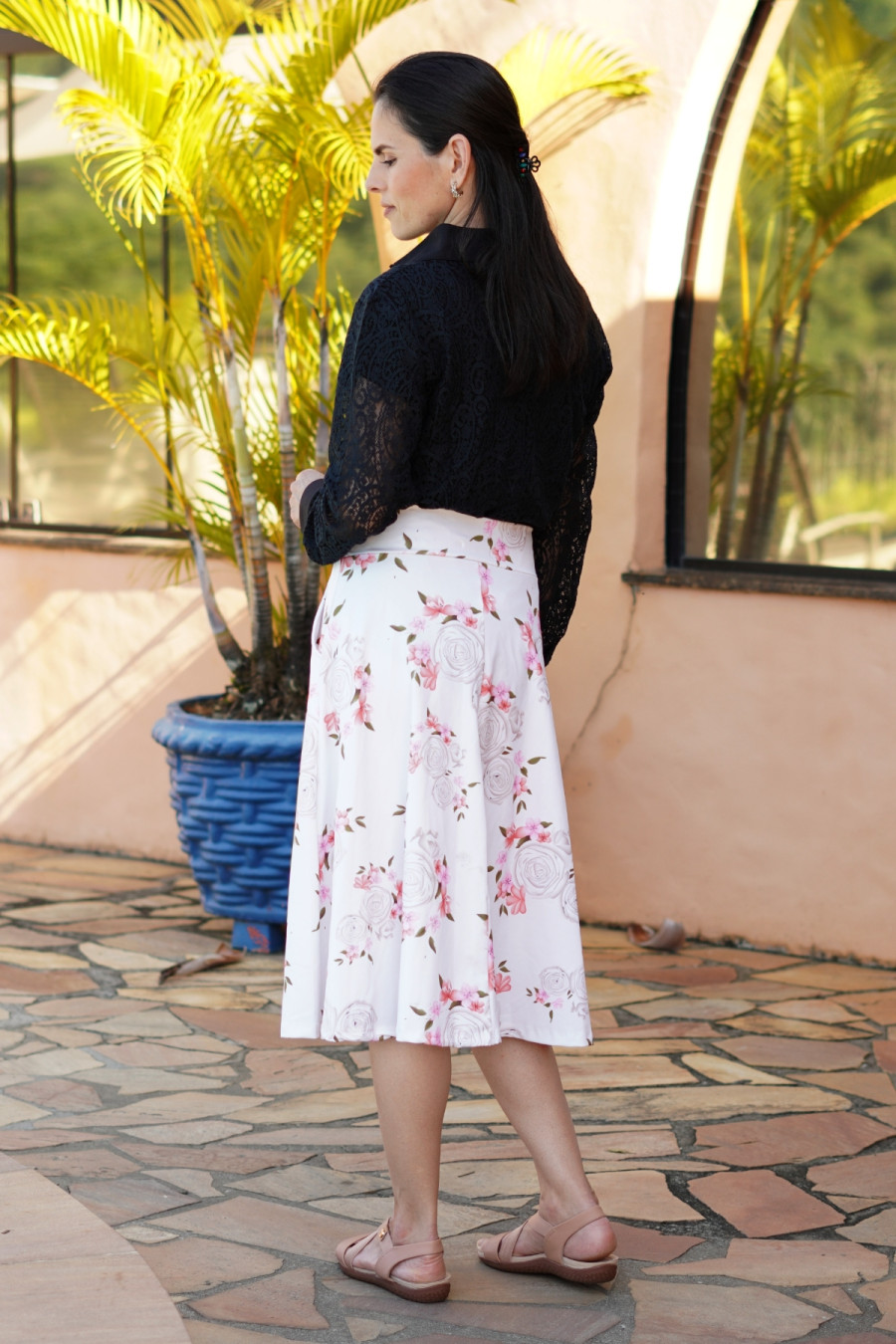 Saia modesta midi godê em tecido malha suplex, cor branca com estampa floral. Possui detalhe de cinto de mesmo tecido, costurado na saia e bolsos. Está disponível nos tamanhos P, M e G.