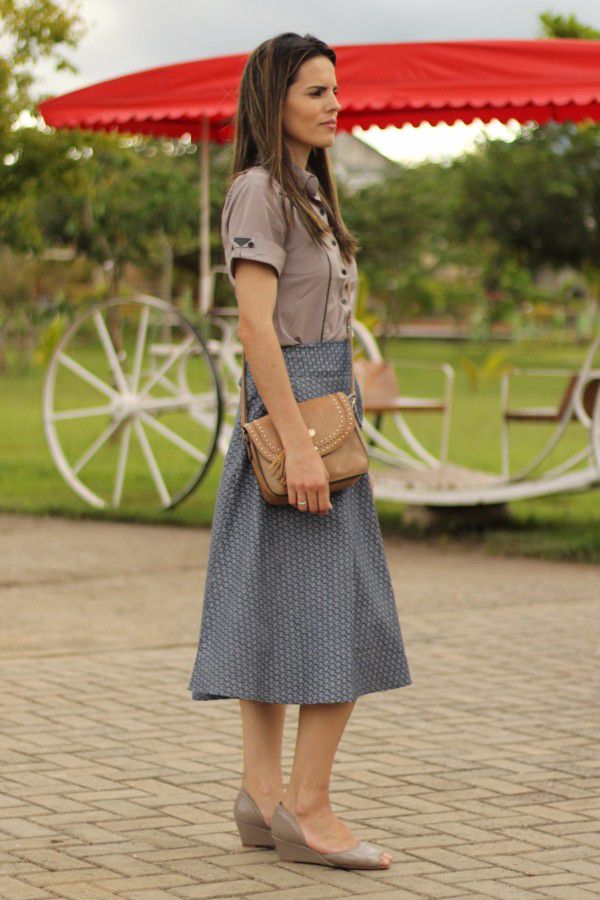 O comprimento da saia midi ou média vai até a altura da canela e por vezes, pode quebrar o visual da silhueta feminina. Alguns truques, como escolher sapatos claros e próximos ao tom da pele ajudam a quebrar esse efeito. Sapatos de salto também são bem vindos nesse caso. Ainda assim, usar saia midi e bota e saia midi jeans com tênis são ótimas opções de look com saia midi quando se quer um visual despojado e super moderno. Temos uma seleção de saias católicas, algumas também chamadas saias evangélicas. Confira!
