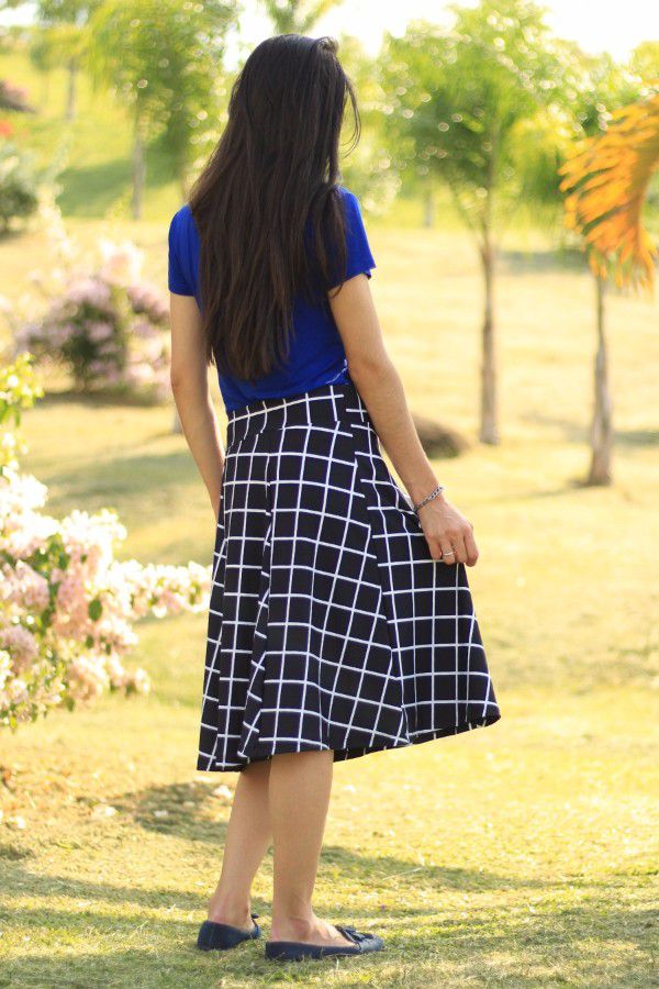 Saia modesta midi de nesgas, cor preta com estampa grid branca. Está disponível em tamanho único.