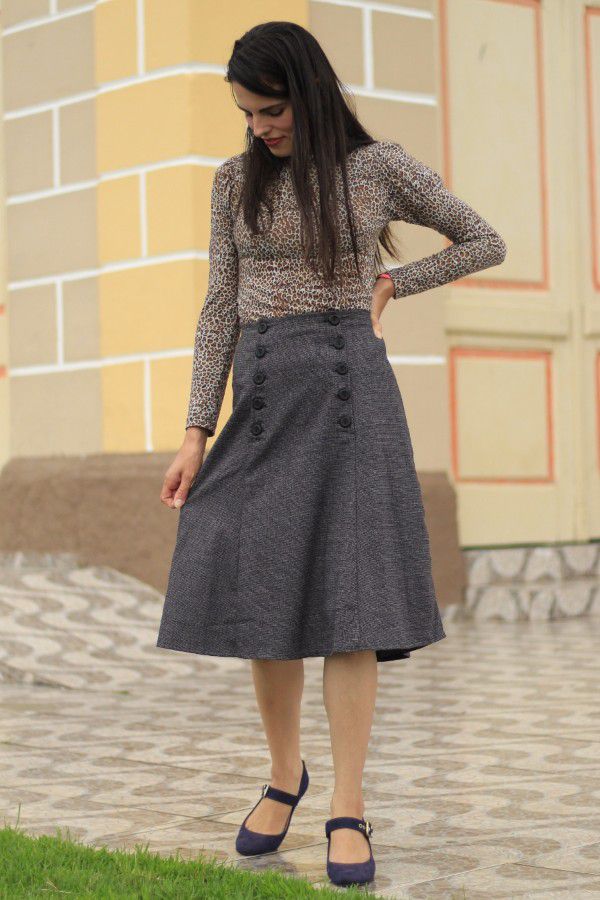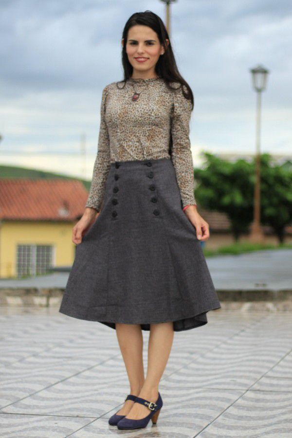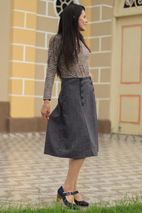 Saia modesta midi evasê, cor cinza com botões. Está disponível nos tamanhos P, M e G.