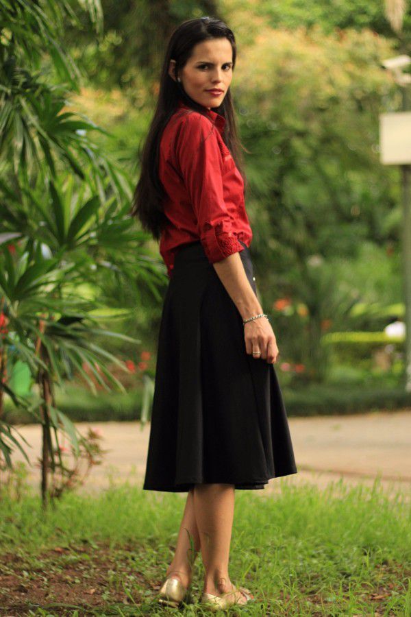 Esse modelo de saia possui um design mais arredondado, o que faz com que o excesso de tecido fique em formato de camadas verticais. Isso torna o figurino mais elegante e sofisticado. A saia midi é confeccionada em tecidos como a viscose, o poliéster e algodão.