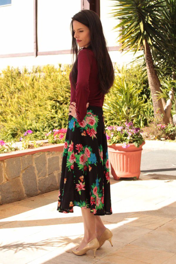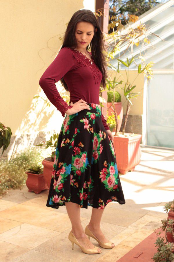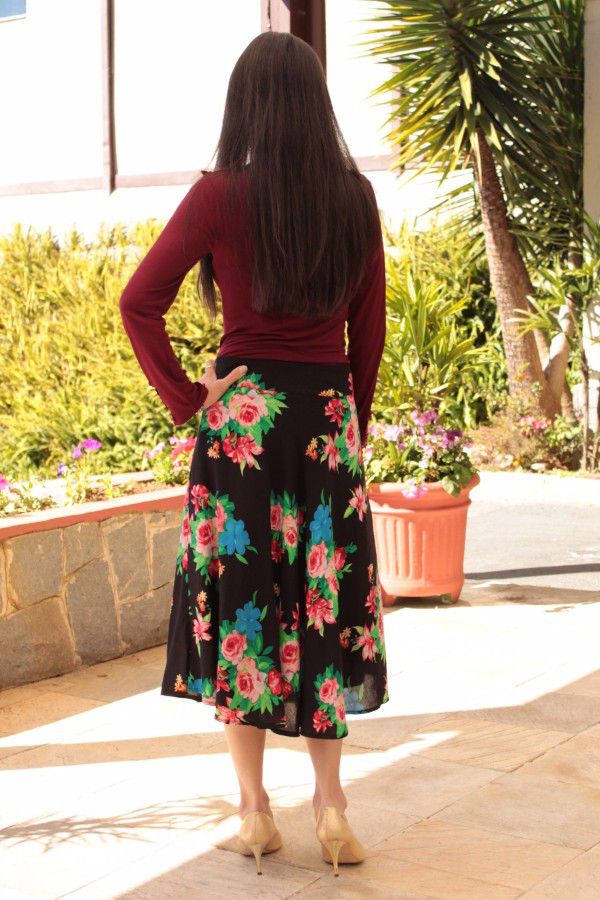 Saia modesta midi godê simples em tecido viscose, cor preta e floral. Está disponível nos tamanhos P, M e G.