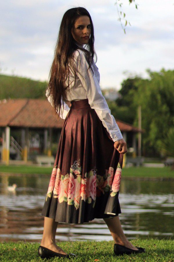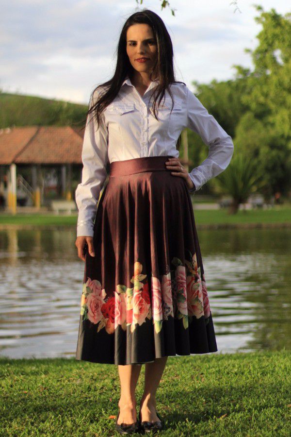 Saia modesta midi godê total em tecido suplex, cor marrom com estampa digital de rosas. Possui elasticidade e está disponível nos tamanhos P, M ou G.