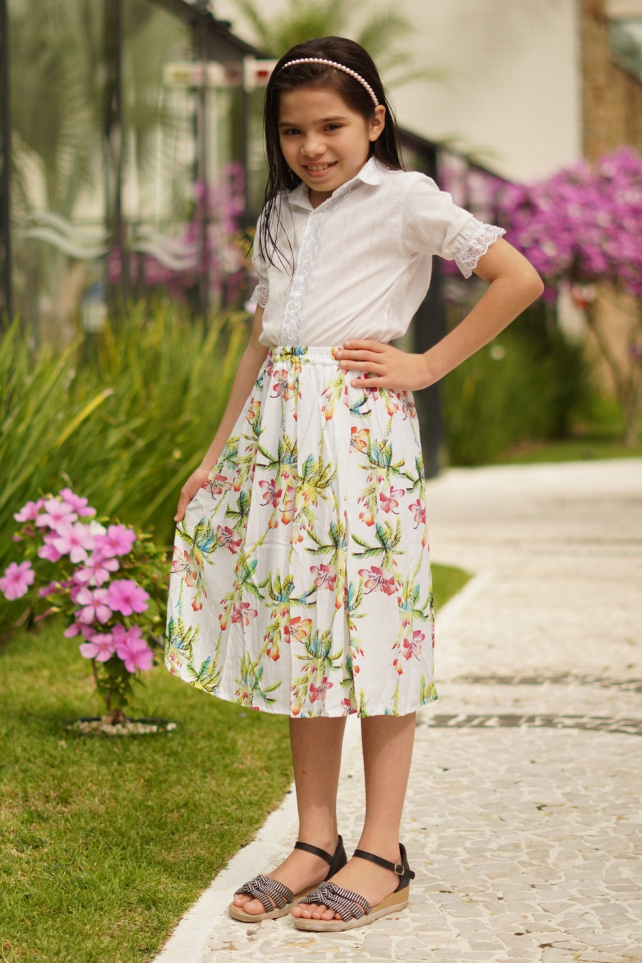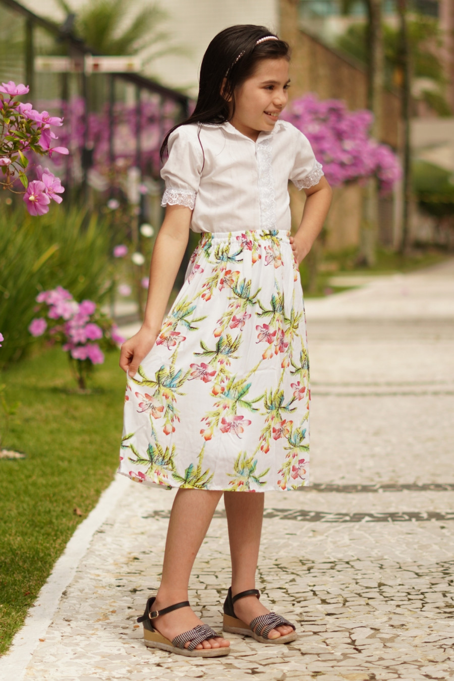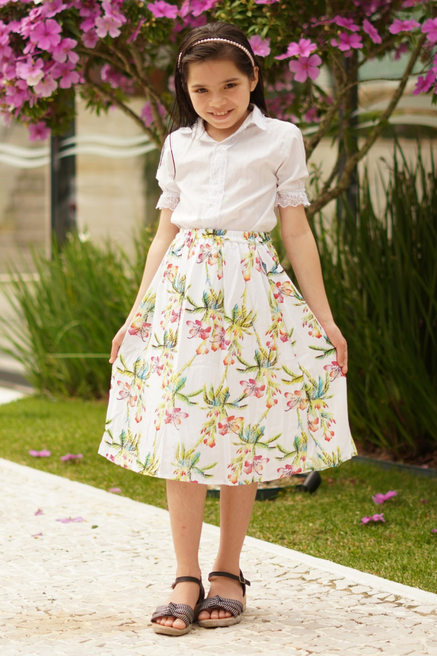 Saia modesta midi infantil franzida, confeccionada com elástico na cintura em viscose, possui forro, cor branca com estampa de flores. Está disponível em tamanhos M e G.