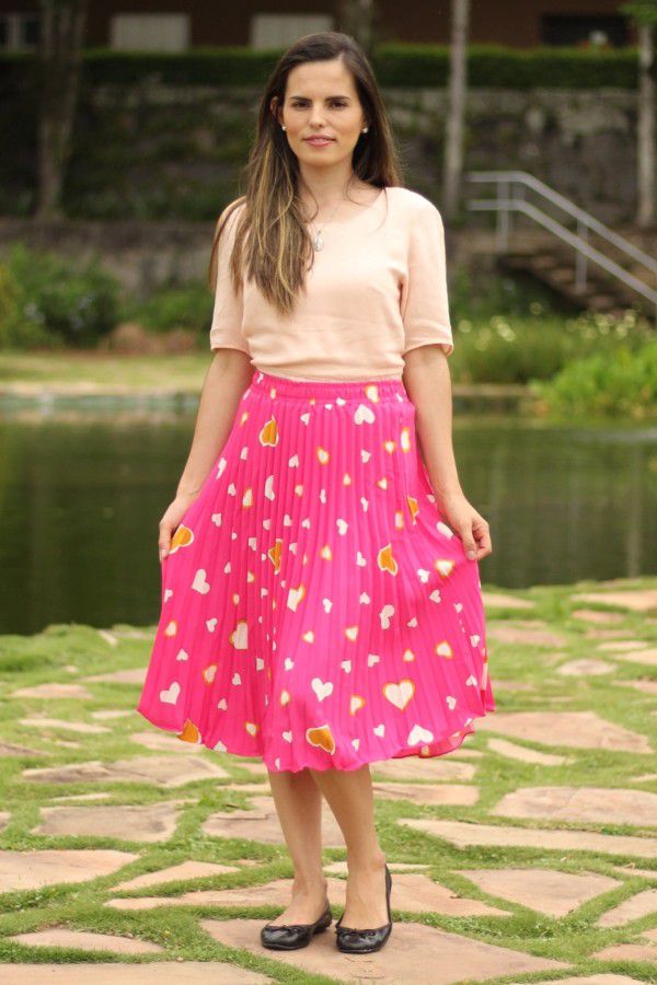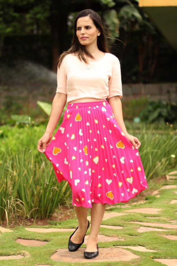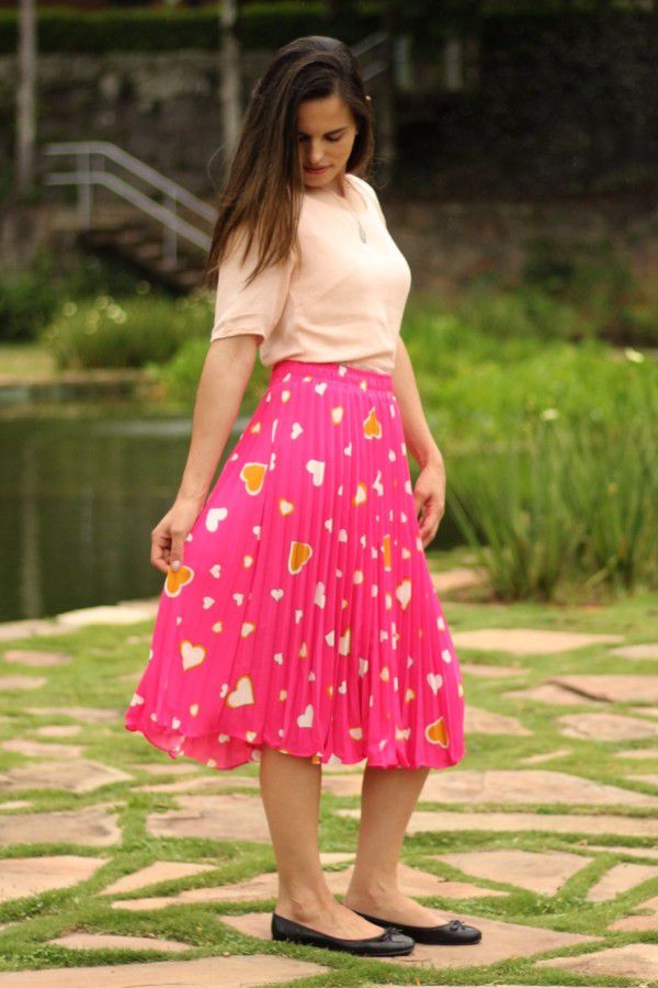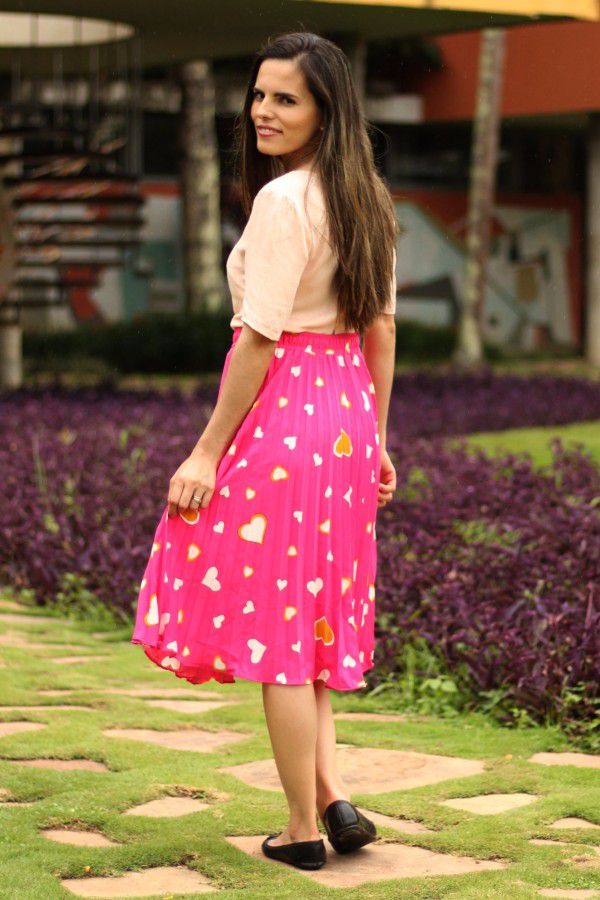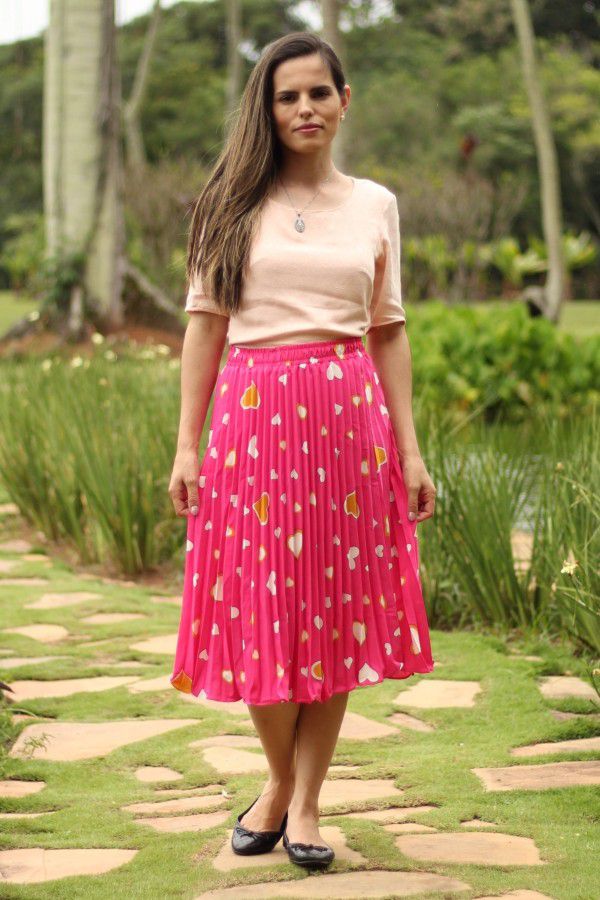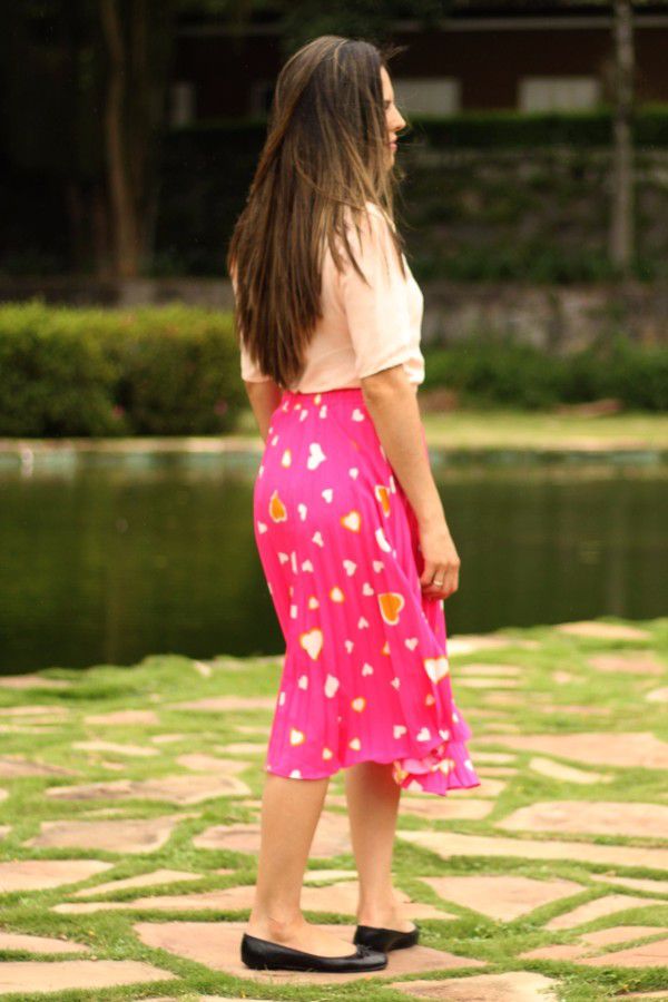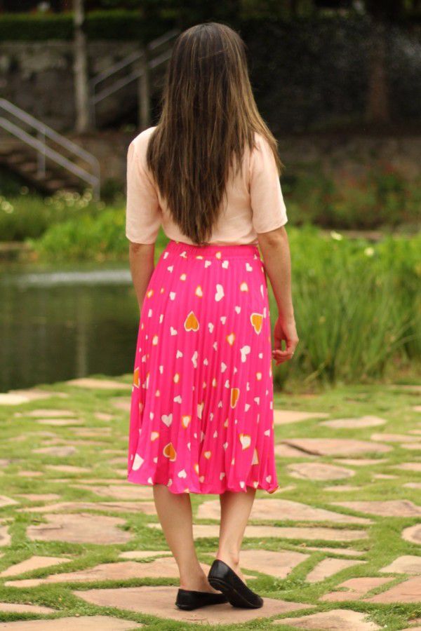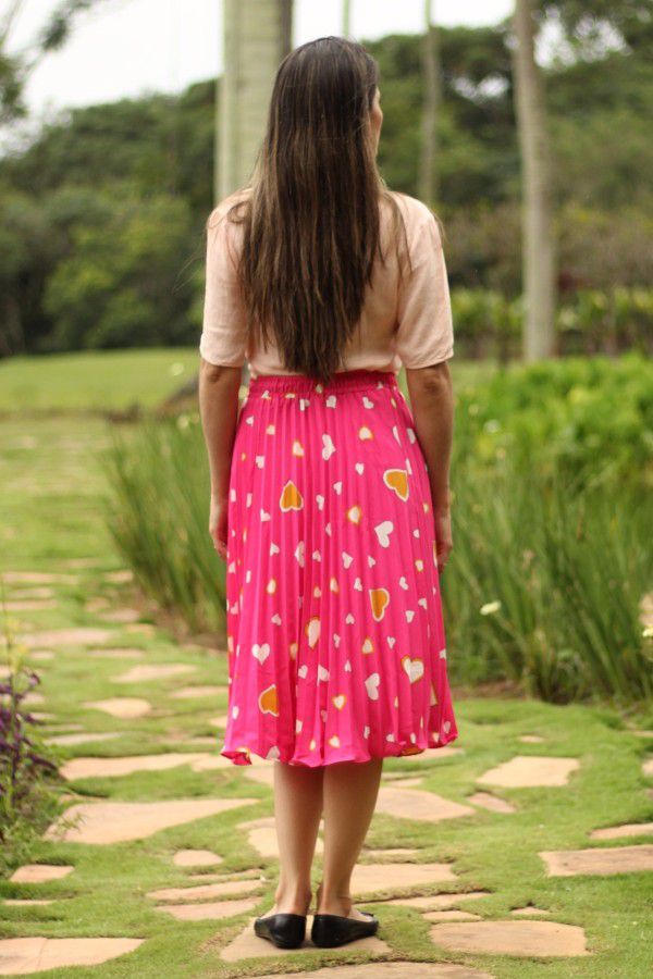 Saia modesta midi plissada, cor pink com estampa de corações. Possui elástico na cintura e está disponível no tamanho M.