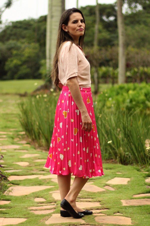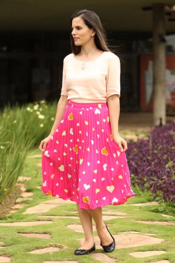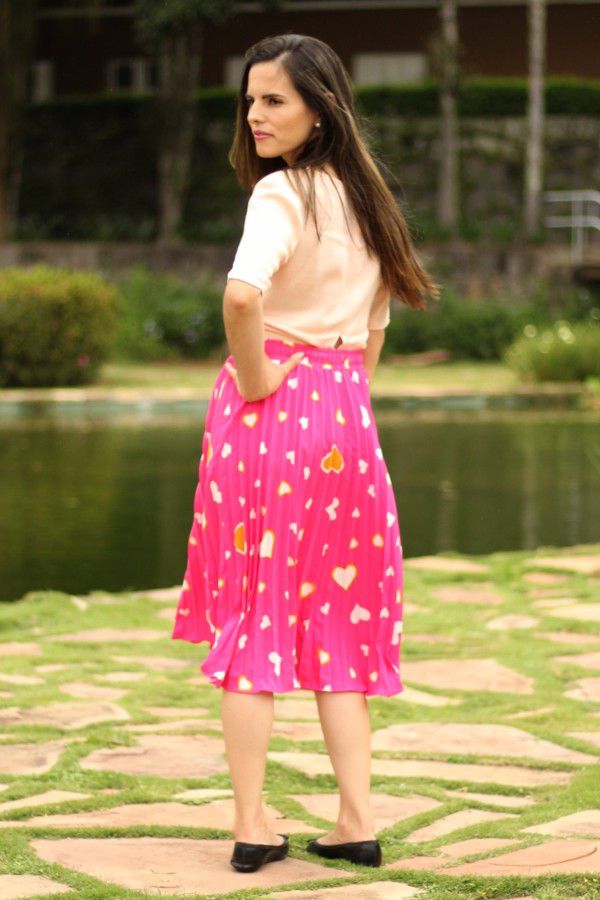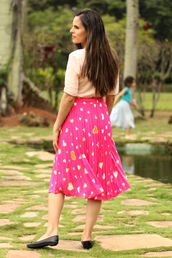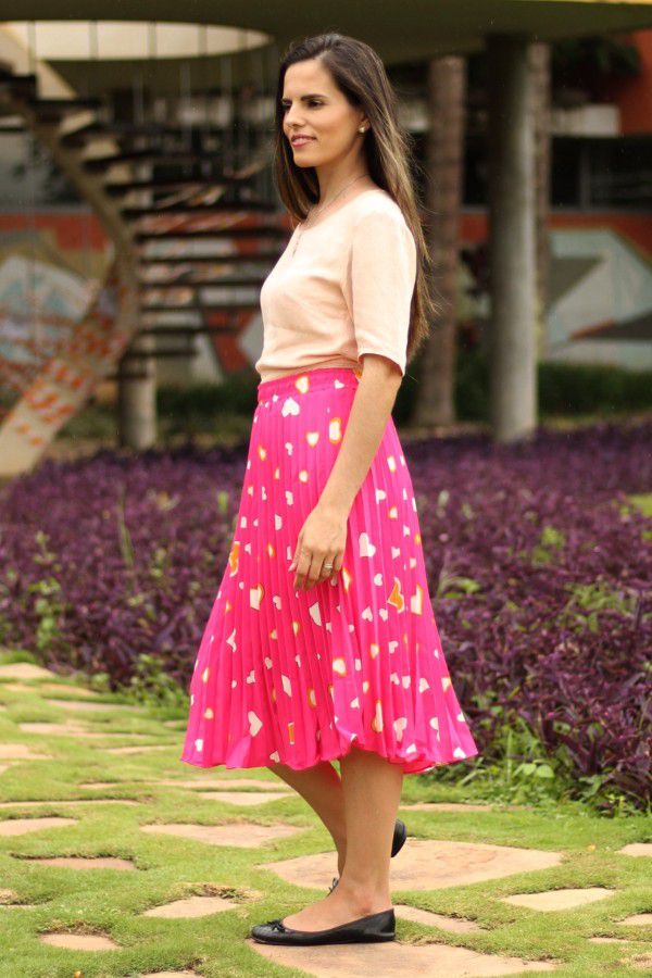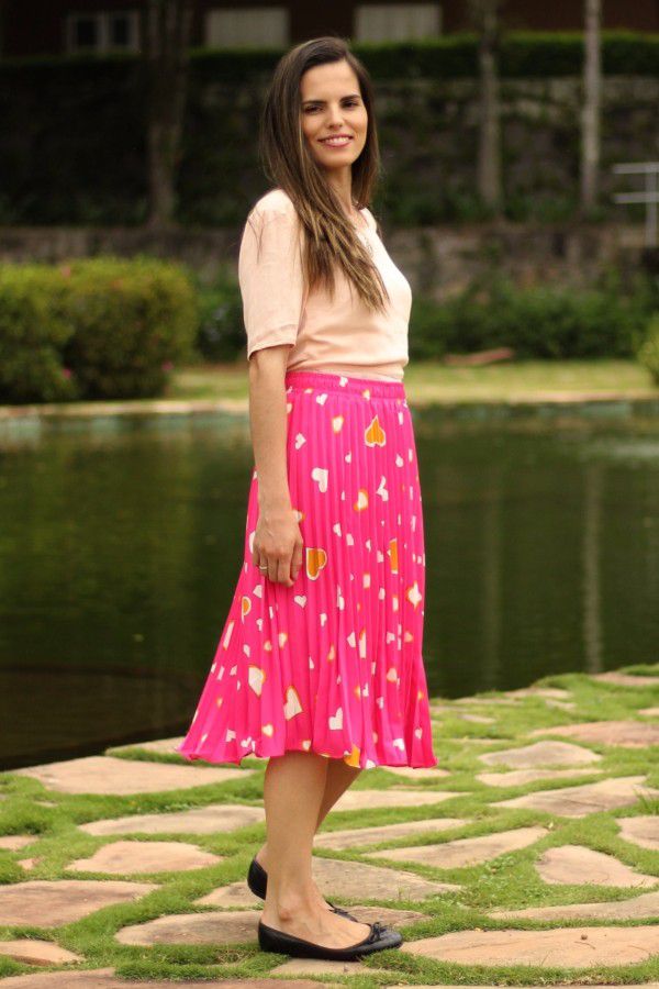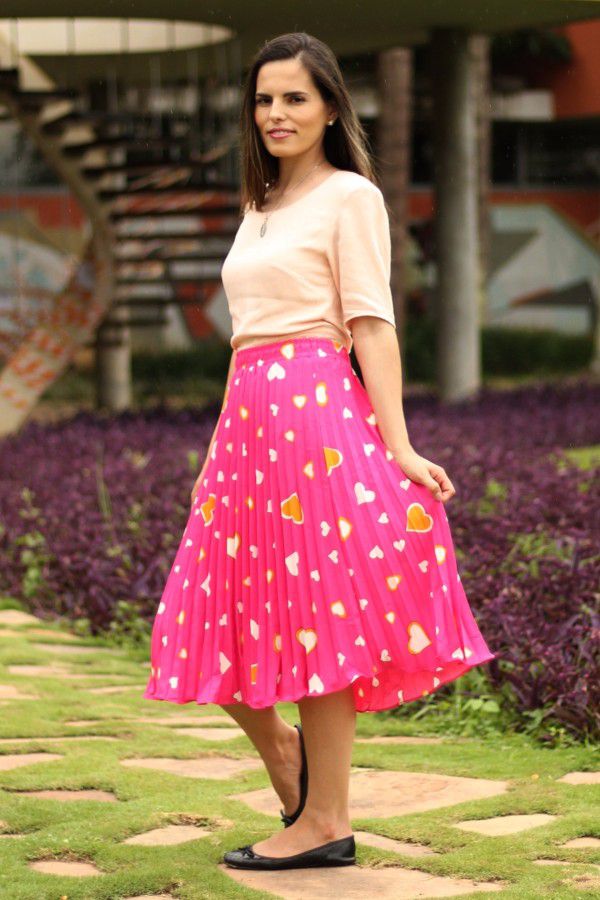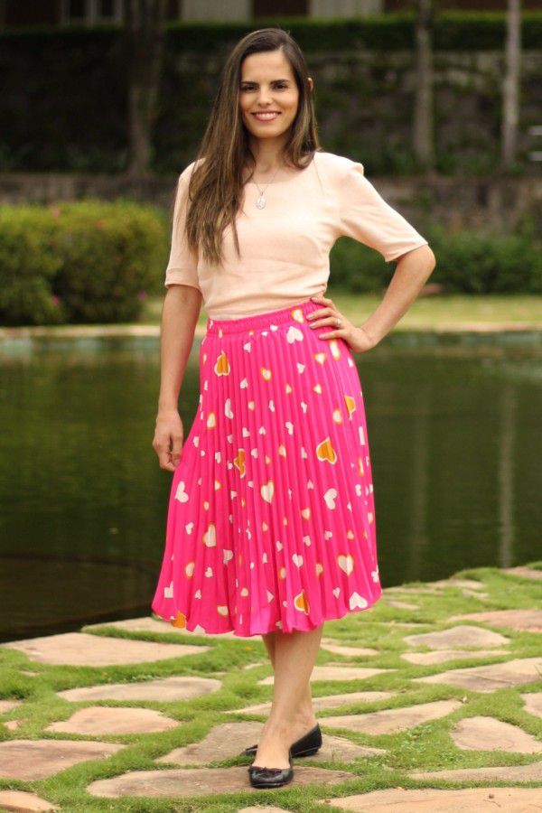 Saia modesta midi plissada, cor pink com estampa de corações. Possui elástico na cintura e está disponível no tamanho M.