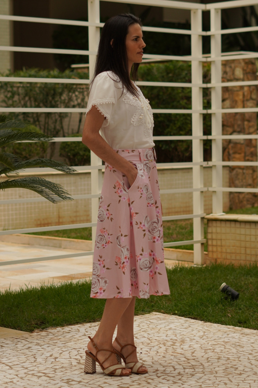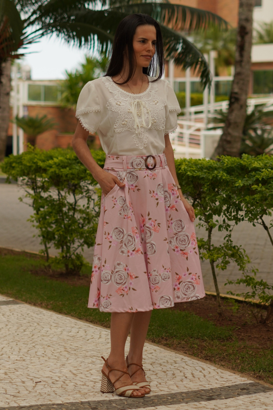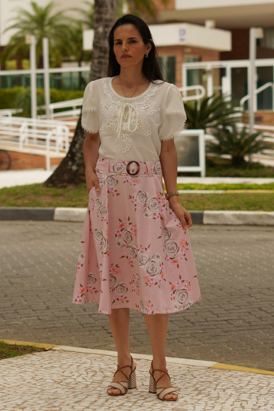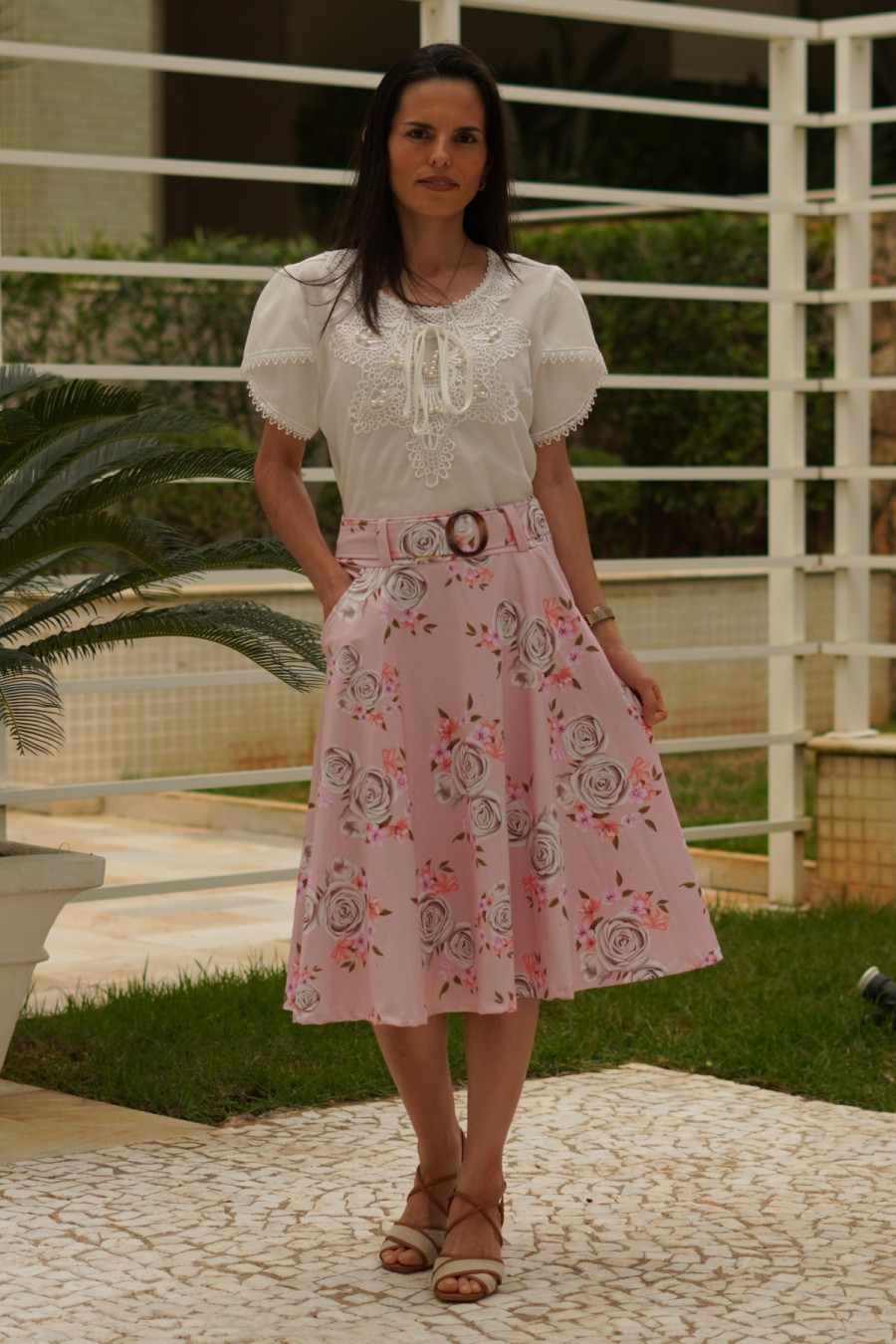 Saia modesta midi godê em tecido malha suplex, cor rosa com estampa de flores. Possui detalhe de cinto de mesmo tecido, costurado na saia e bolsos. Está disponível nos tamanhos P, M e G.