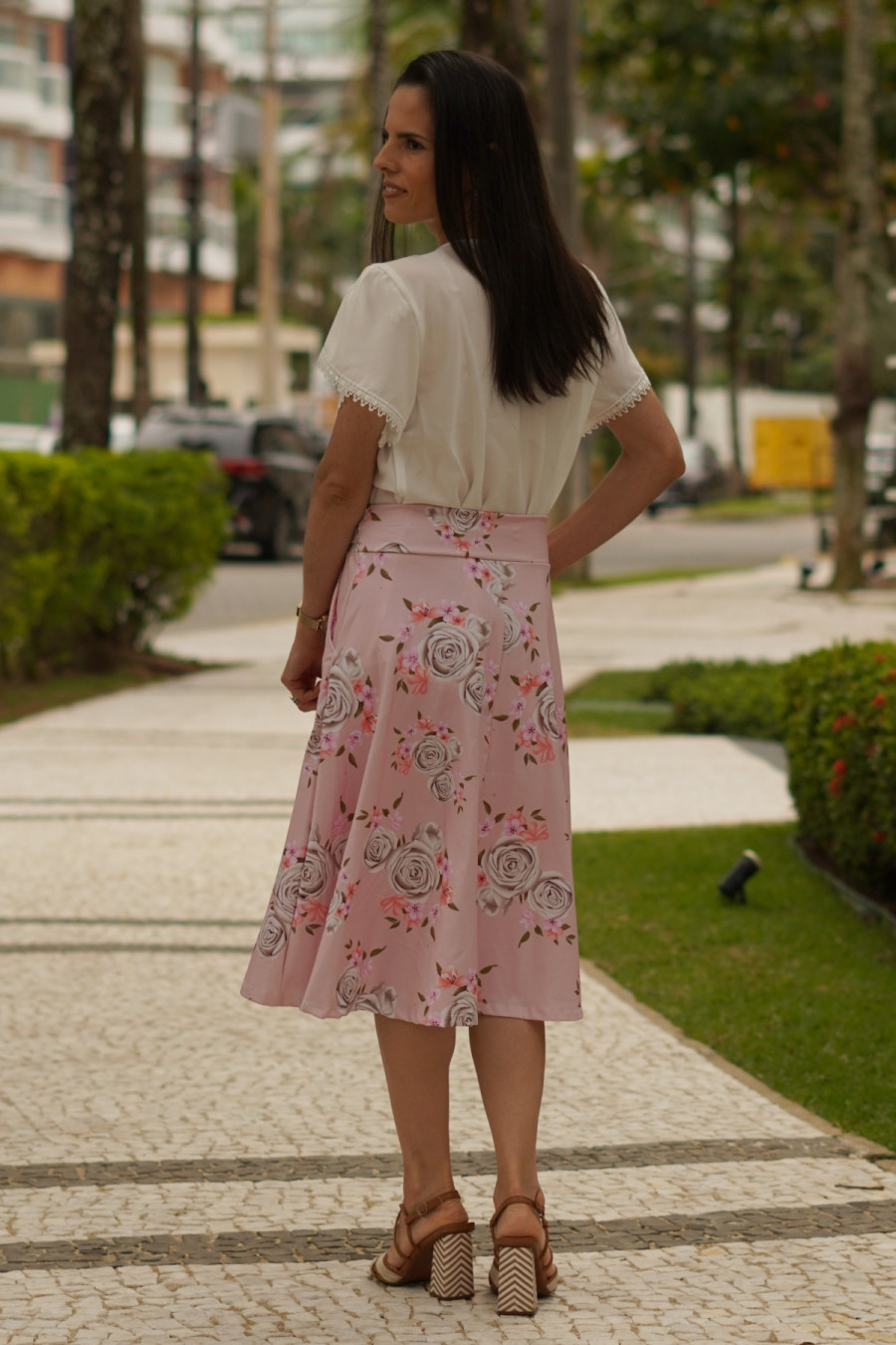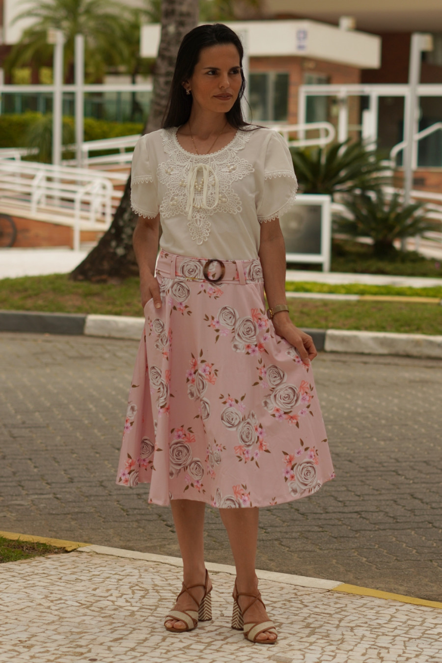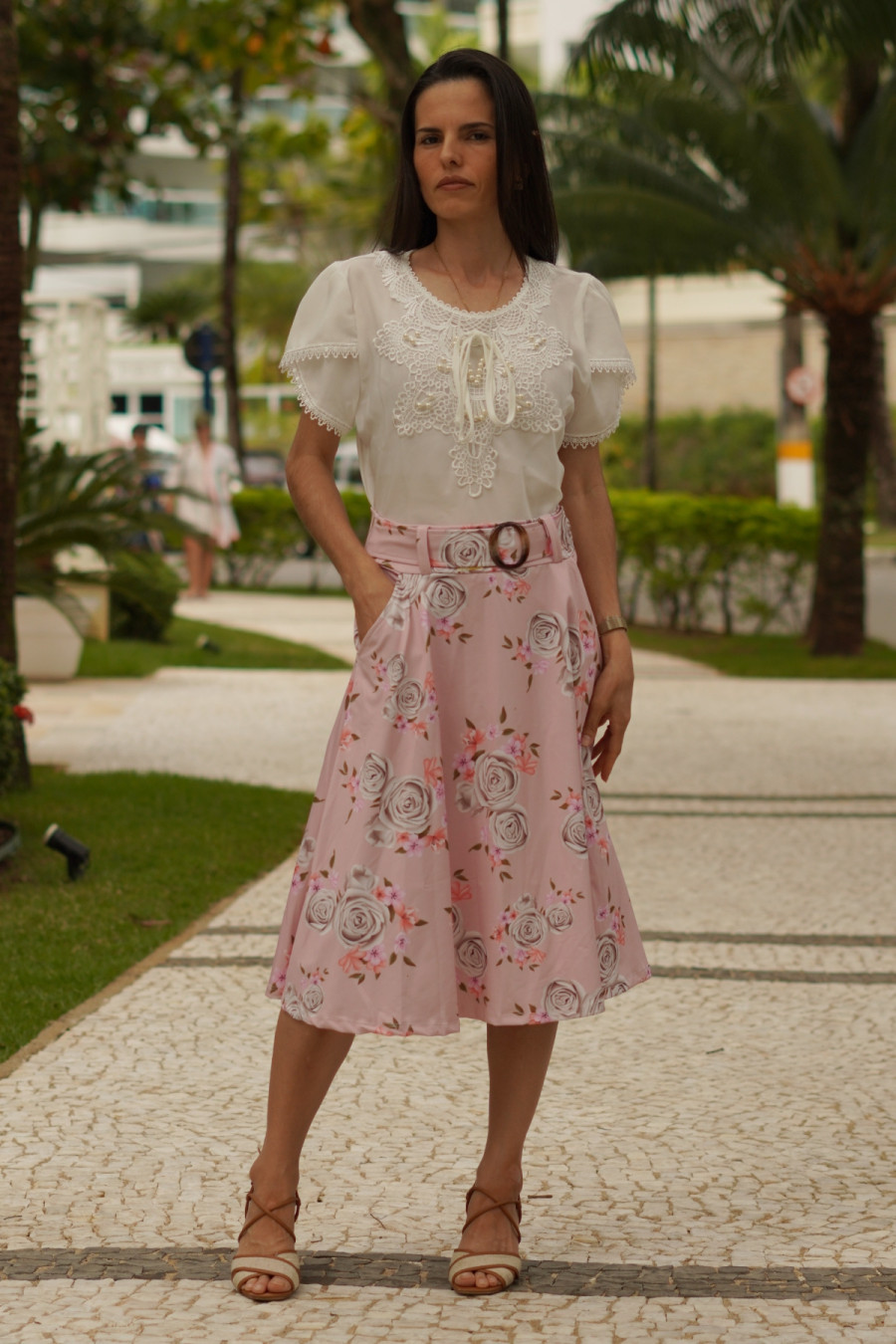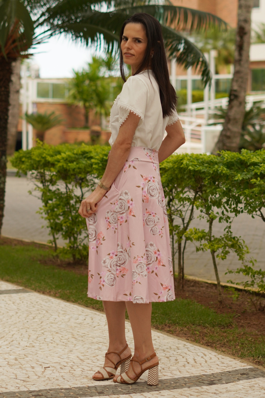 Saia modesta midi godê em tecido malha suplex, cor rosa com estampa de flores. Possui detalhe de cinto de mesmo tecido, costurado na saia e bolsos. Está disponível nos tamanhos P, M e G.