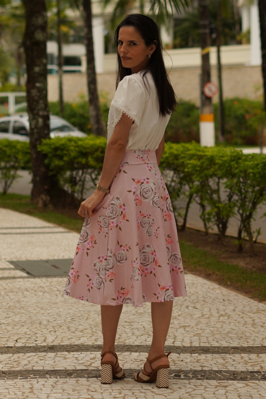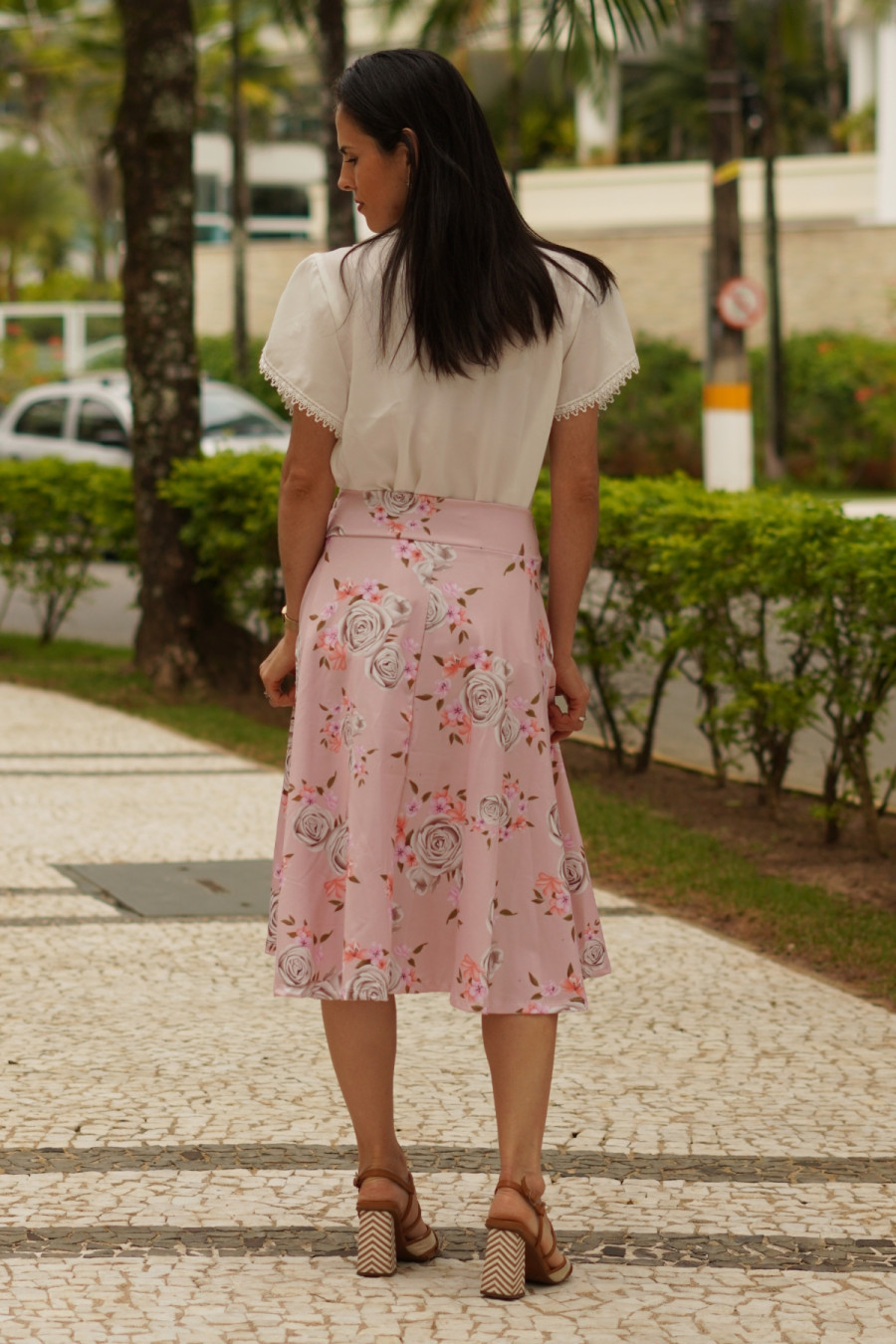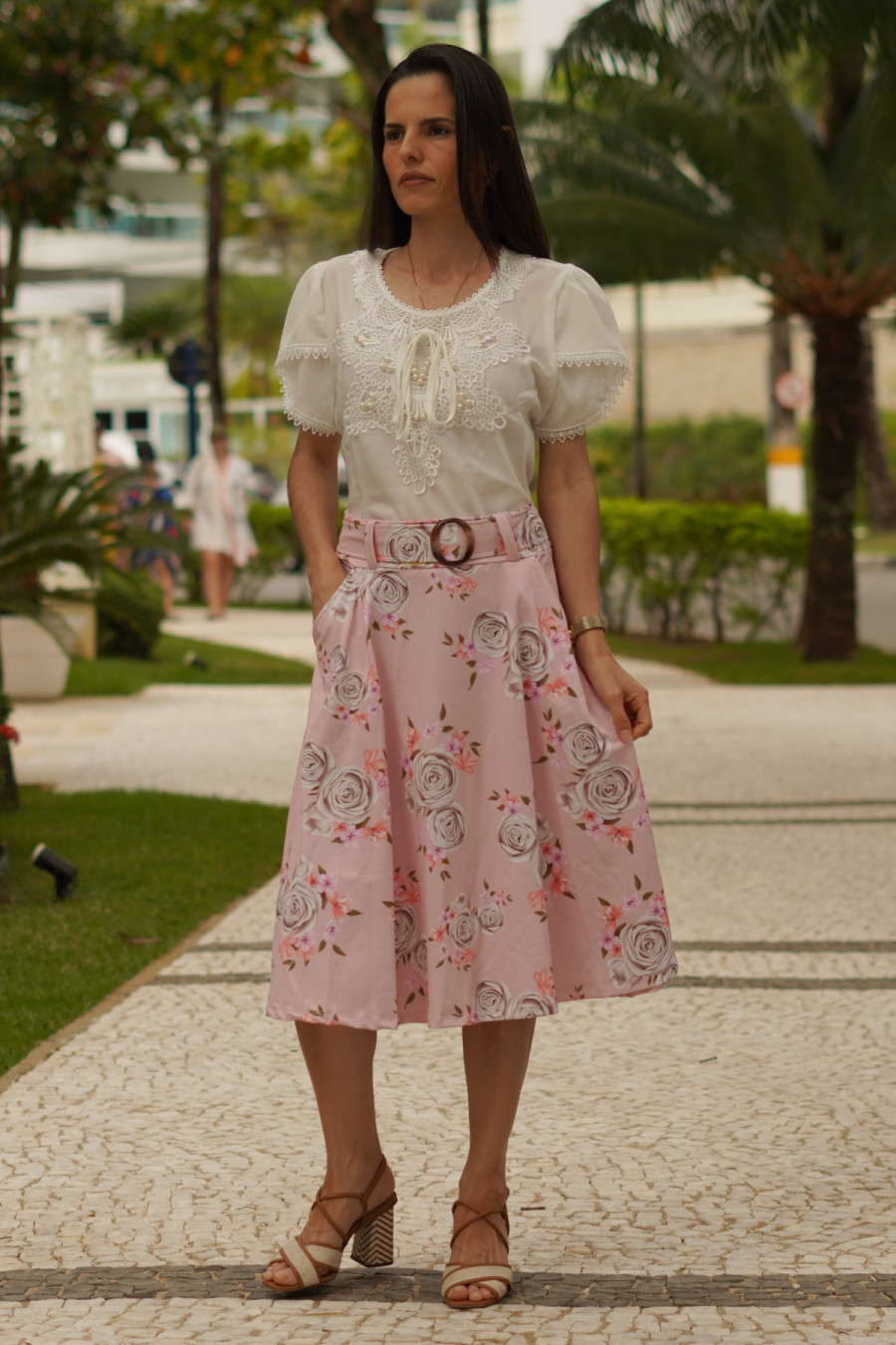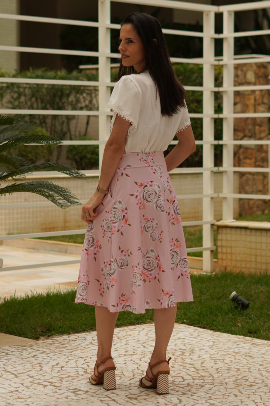 Saia modesta midi godê em tecido malha suplex, cor rosa com estampa de flores. Possui detalhe de cinto de mesmo tecido, costurado na saia e bolsos. Está disponível nos tamanhos P, M e G.