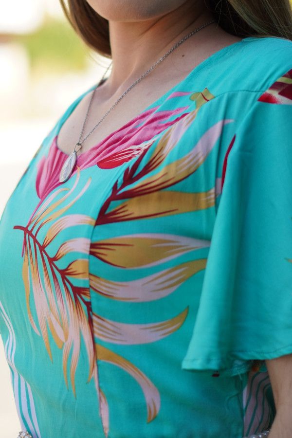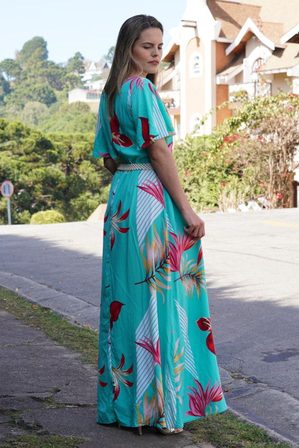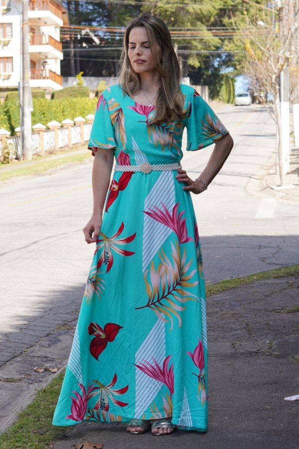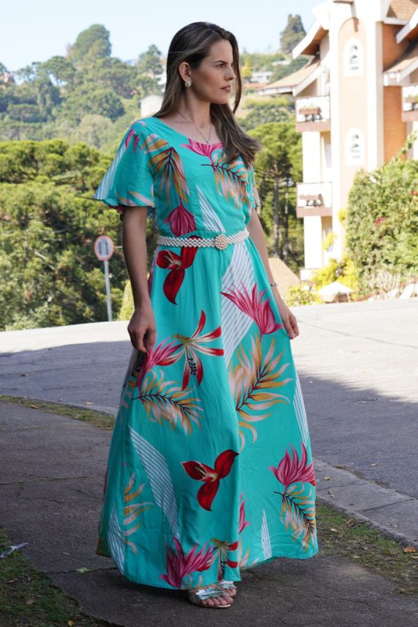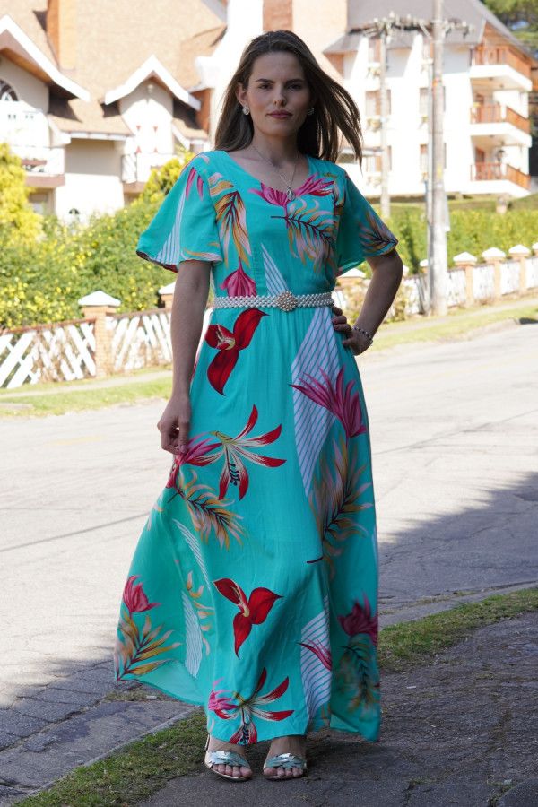 Vestido modesto longo, evasê, em tecido viscose, cor verde estampado. Está disponível nos tamanhos P, M e G.