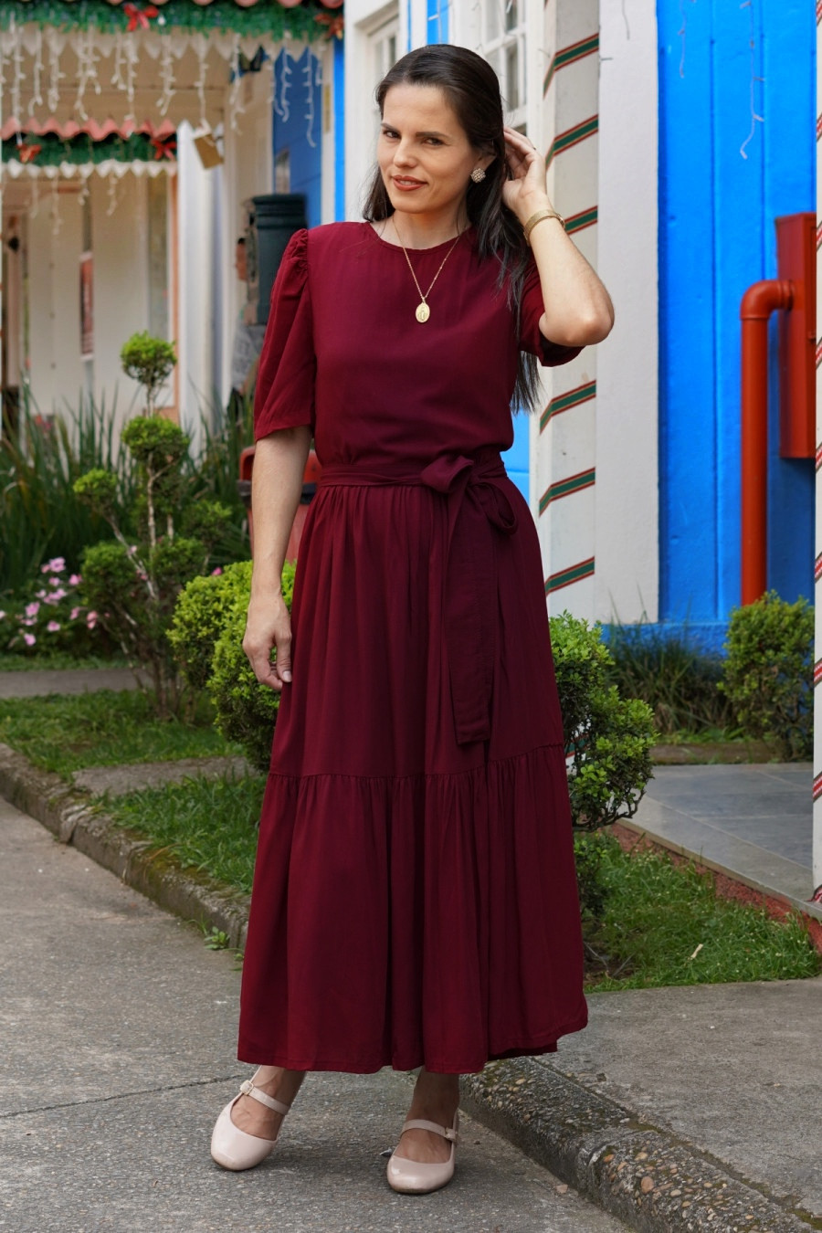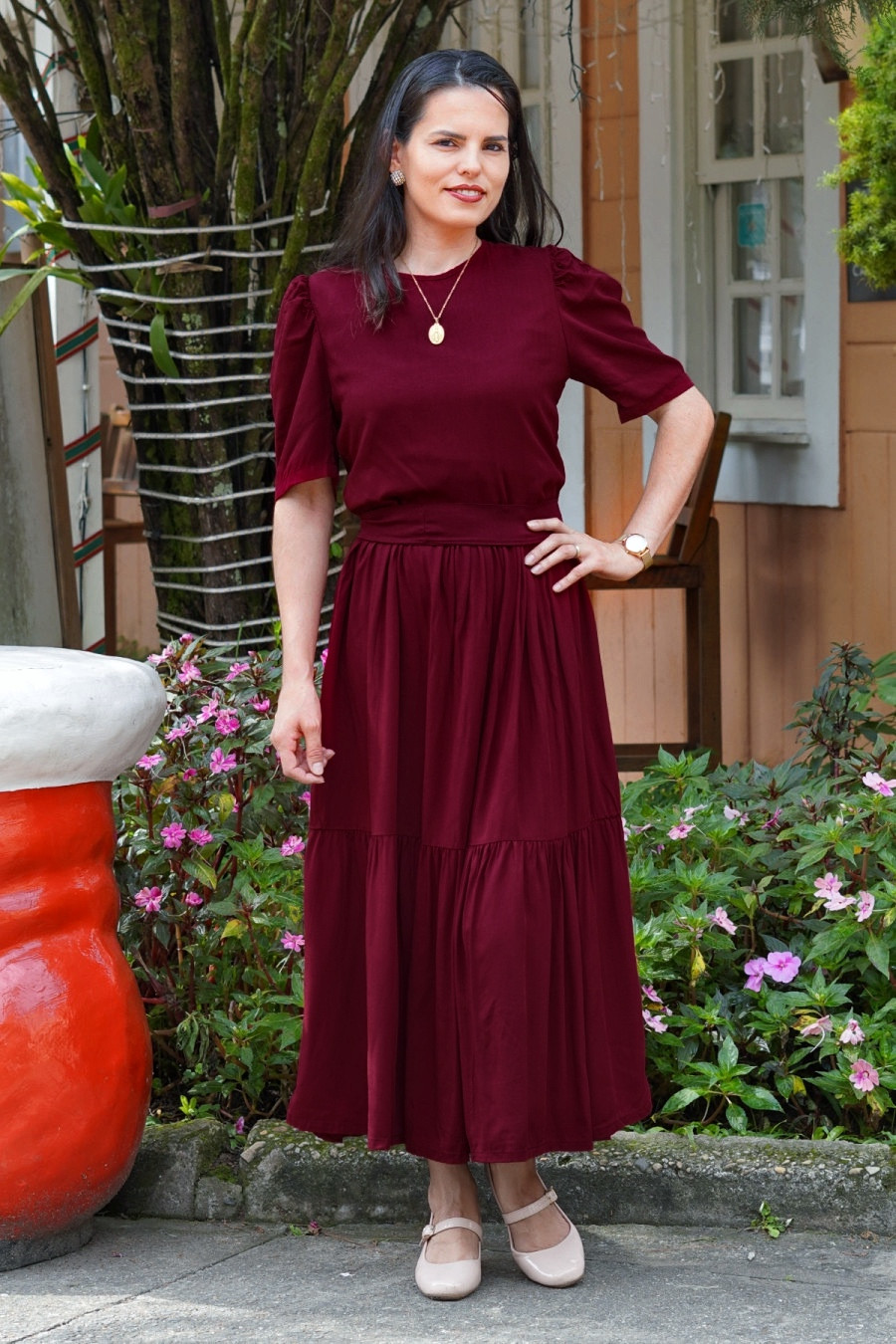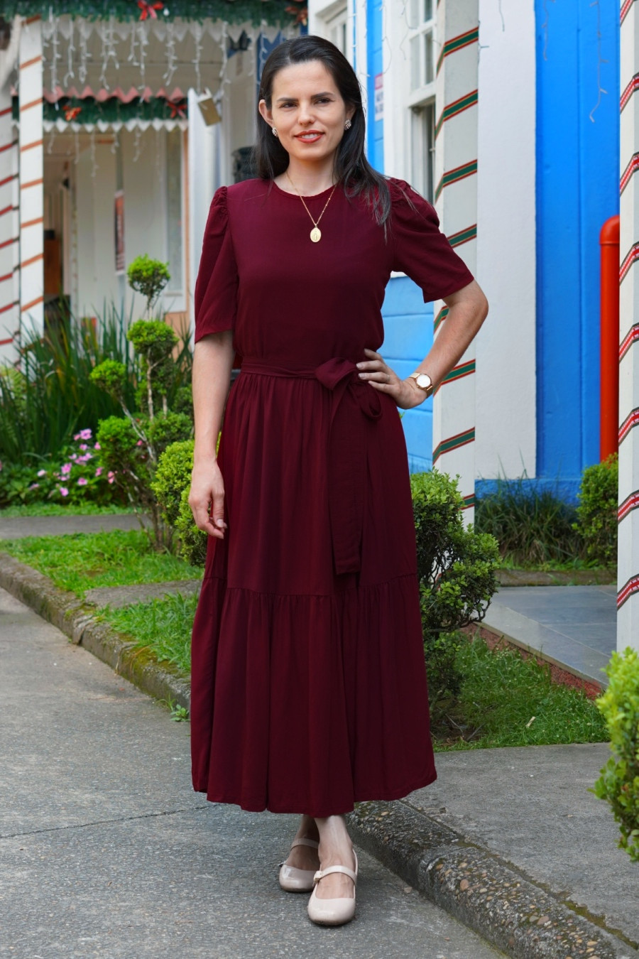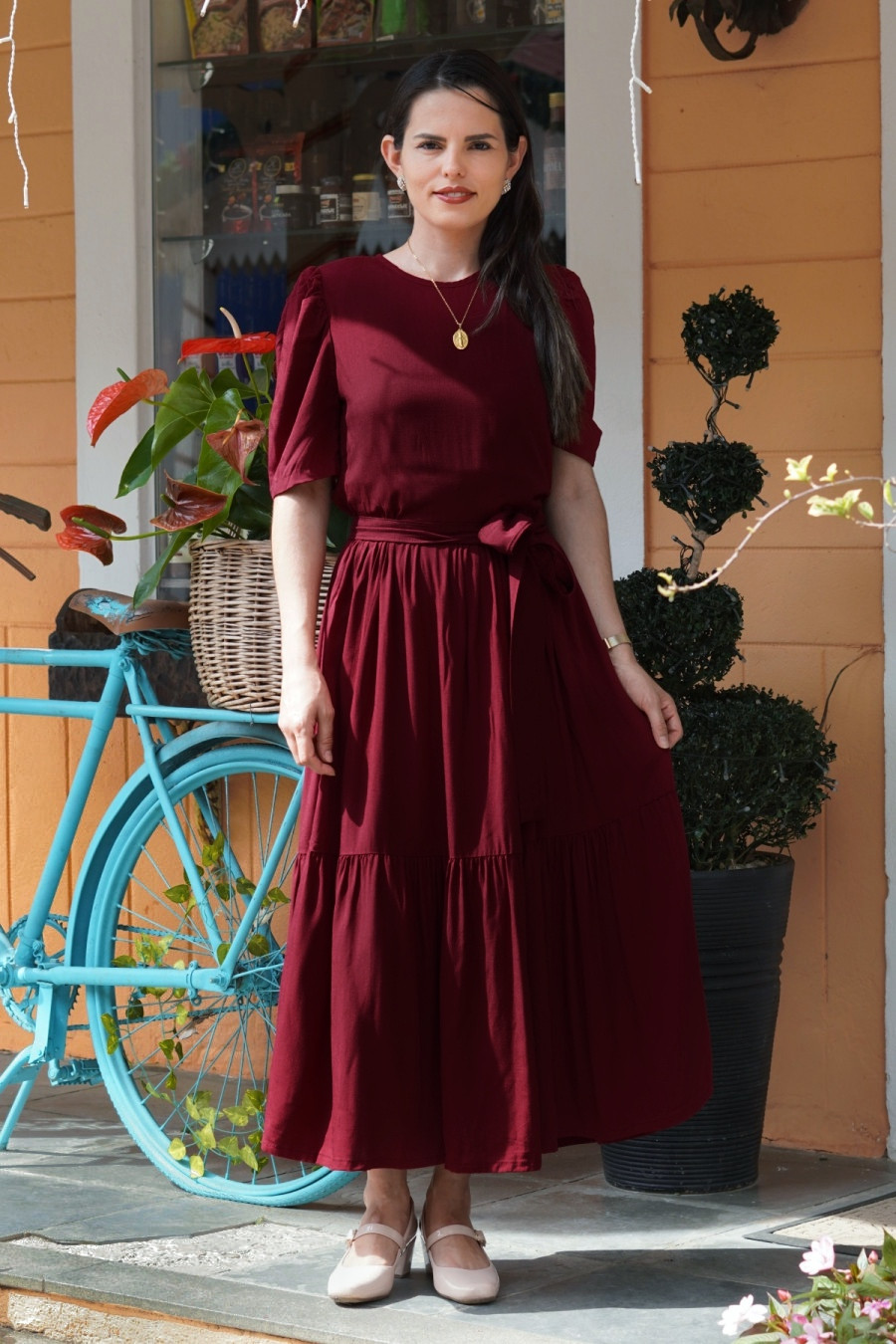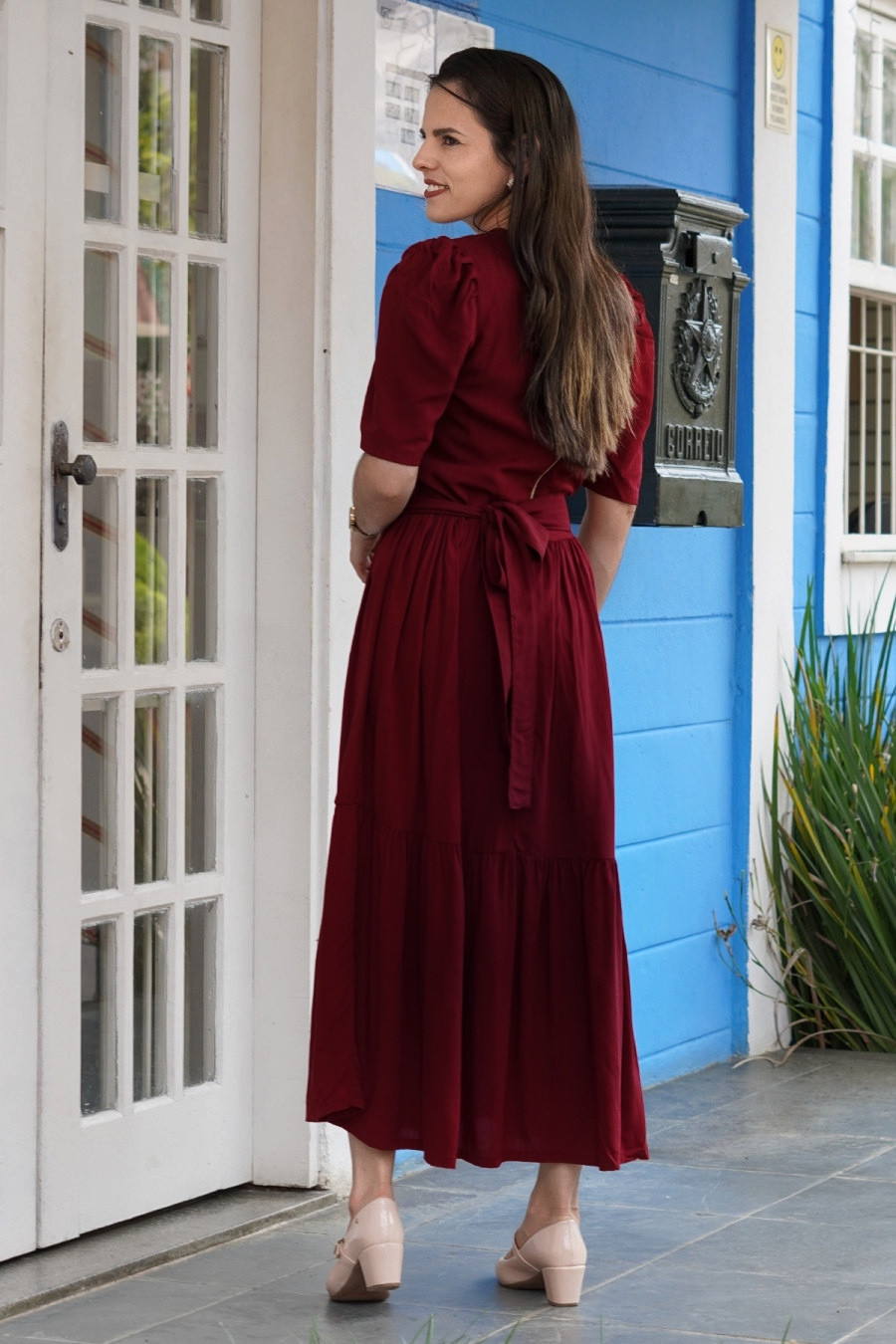 Vestido modesto longo franzido, com uma camada. Em tecido leve, cor marsala, escuro, tipo vinho. Possui zíper nas costa e faixa para ajustar a cintura. Está disponível nos tamanhos P, M, G e GG.