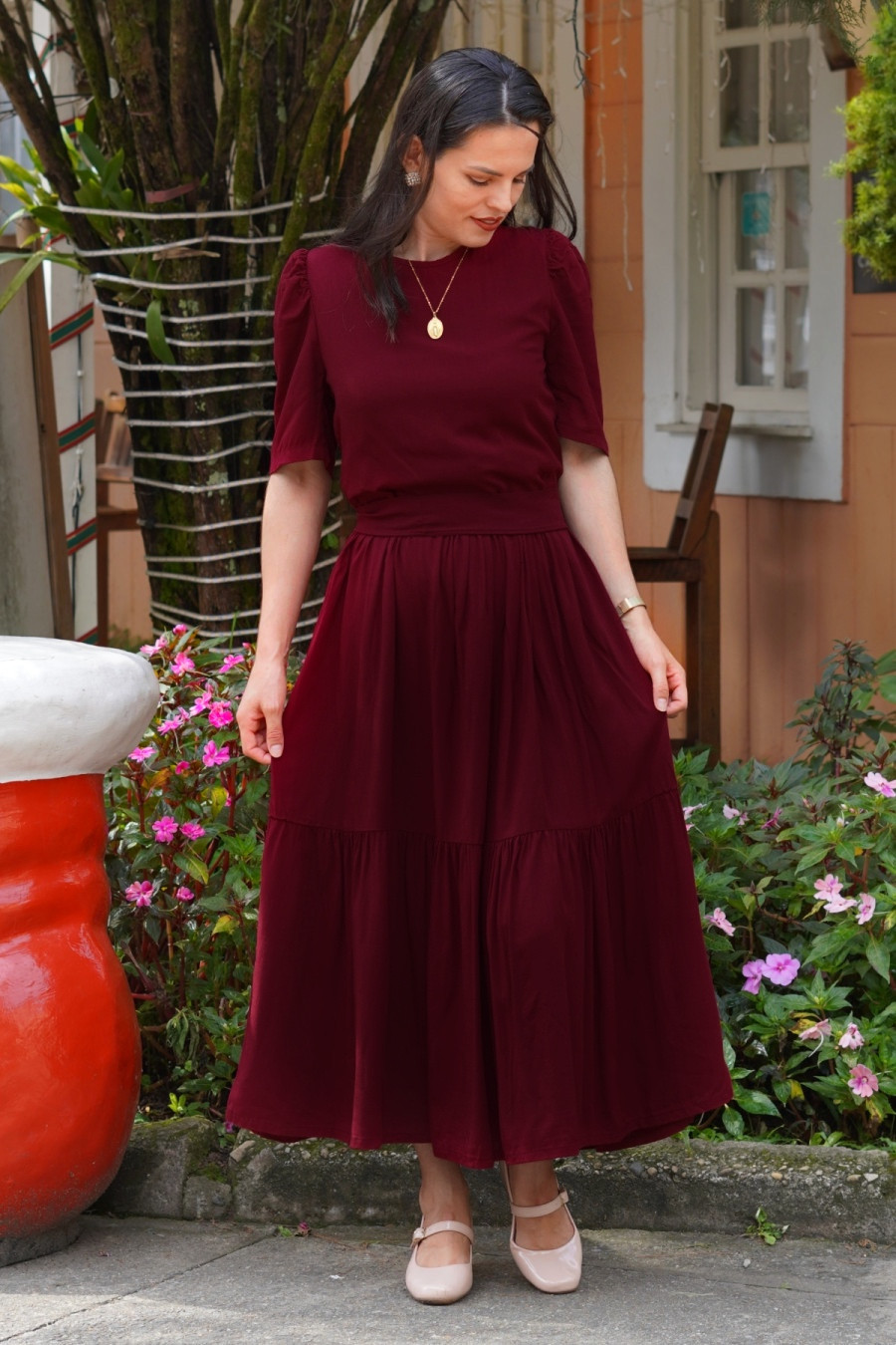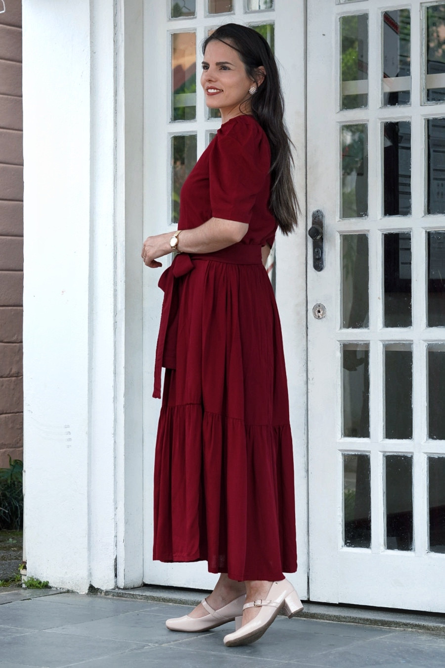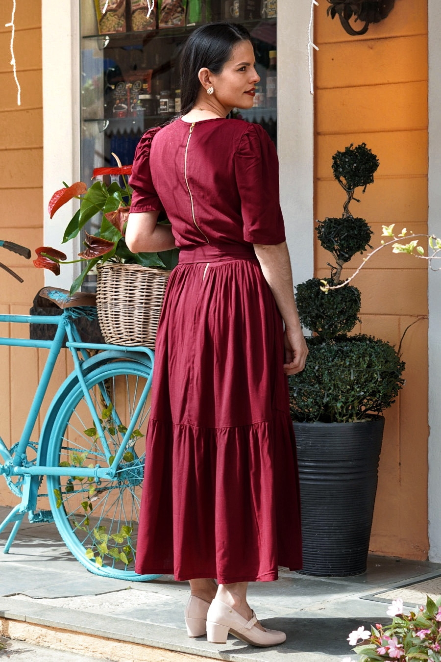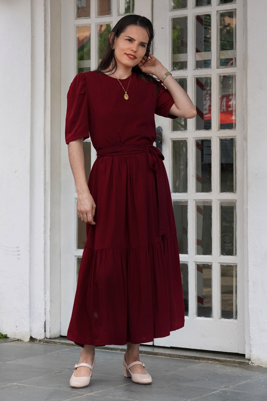 Vestido modesto longo franzido, com uma camada. Em tecido leve, cor marsala, escuro, tipo vinho. Possui zíper nas costa e faixa para ajustar a cintura. Está disponível nos tamanhos P, M, G e GG.