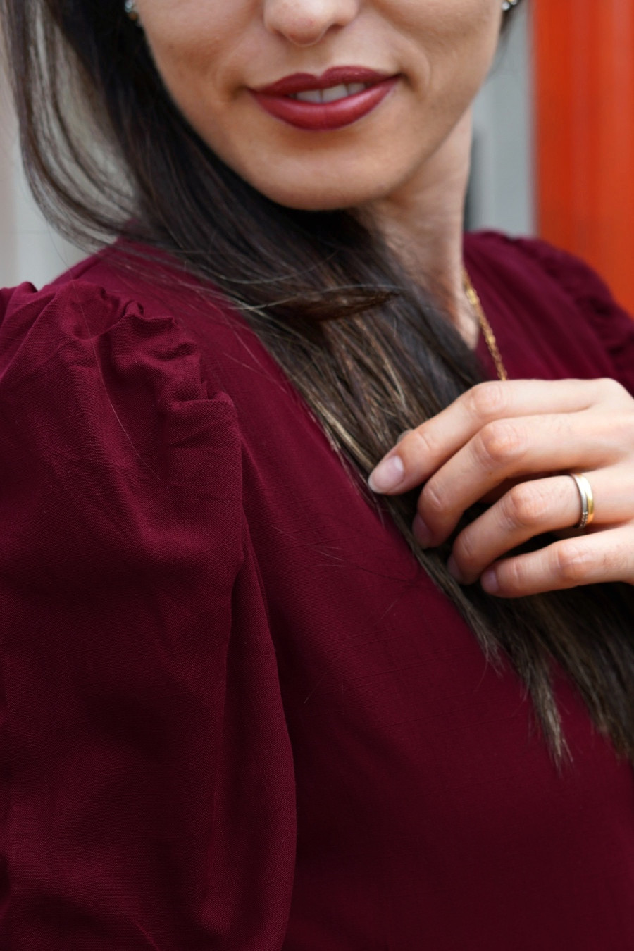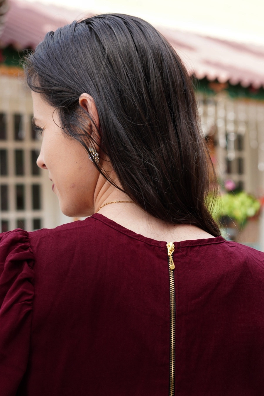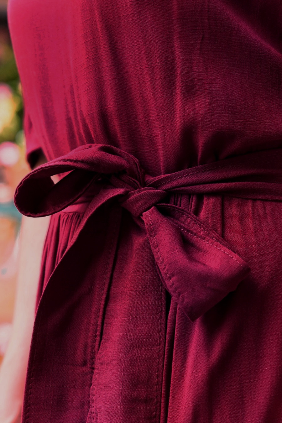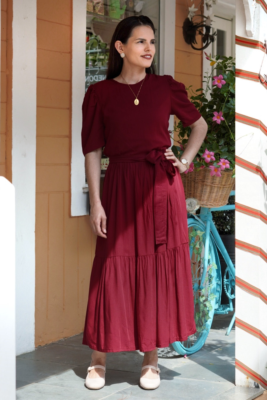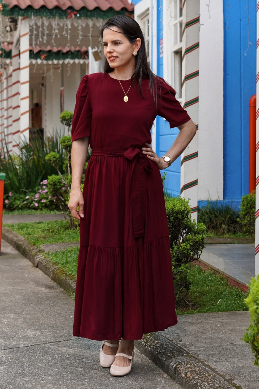 Vestido modesto longo franzido, com uma camada. Em tecido leve, cor marsala, escuro, tipo vinho. Possui zíper nas costa e faixa para ajustar a cintura. Está disponível nos tamanhos P, M, G e GG.