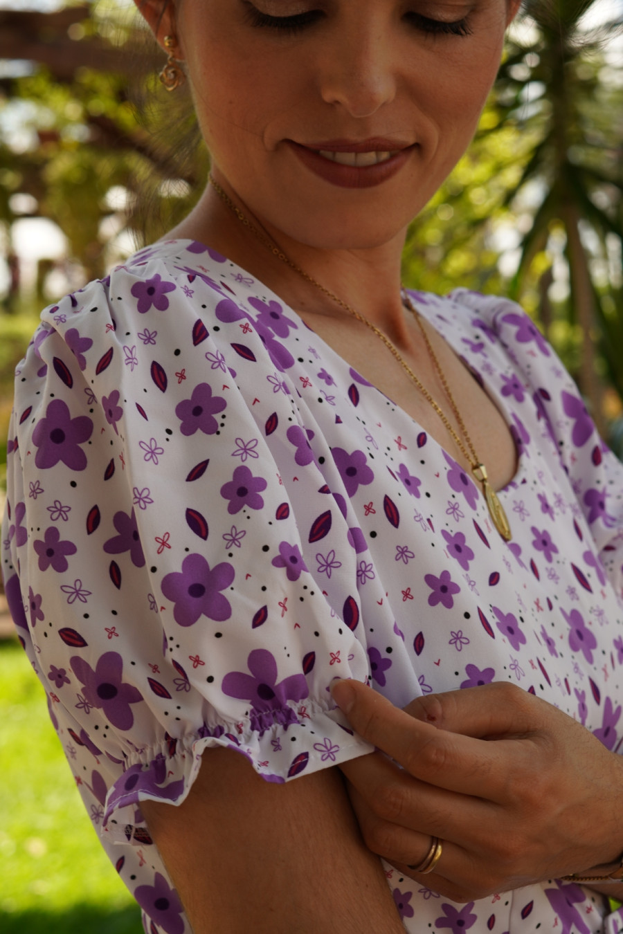 Vestido modesto midi evasê, cor branco com delicada estampa de flores lilas, decote e manga princesa acompanha cinto encapado. Está disponível nos tamanhos P, M, G e GG.