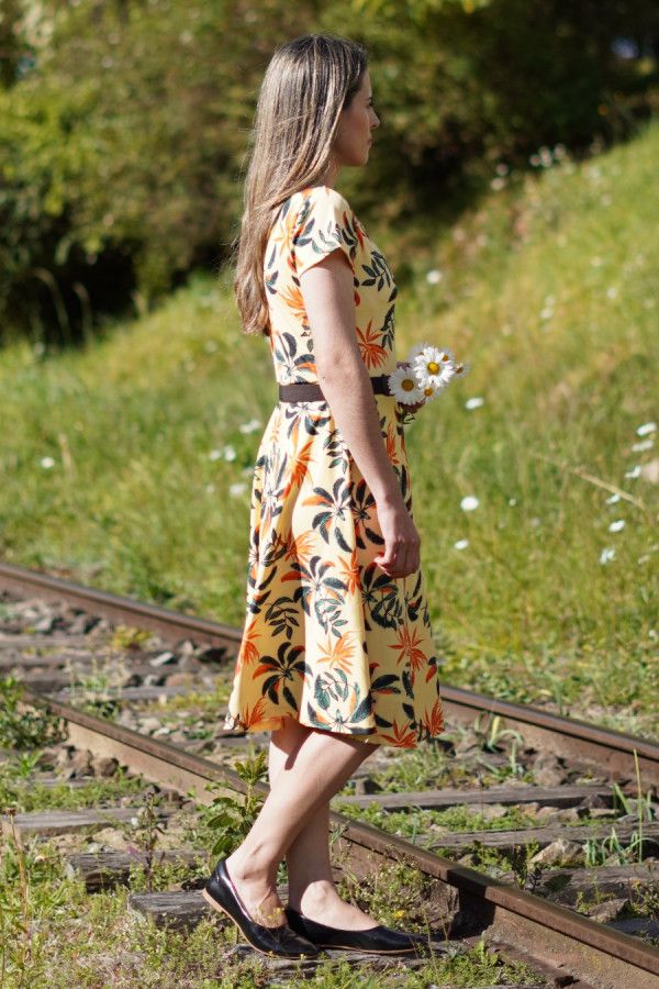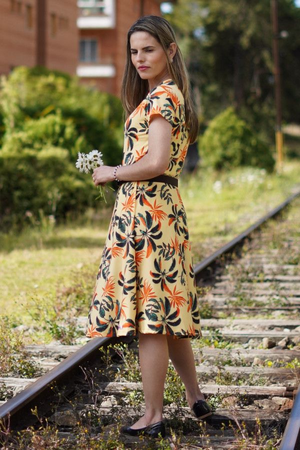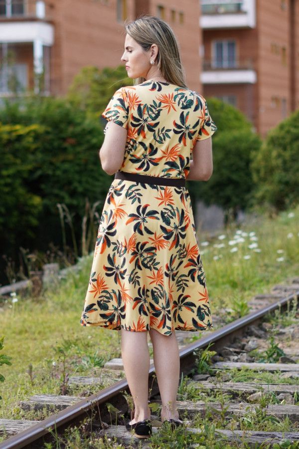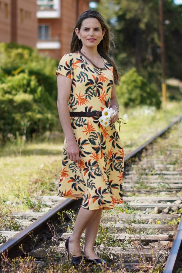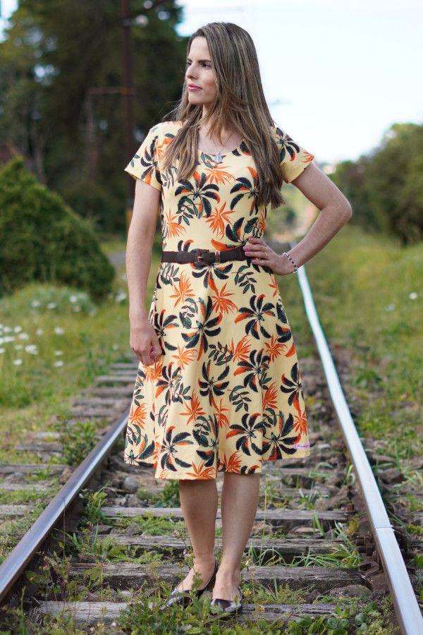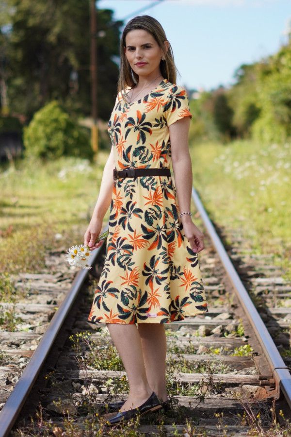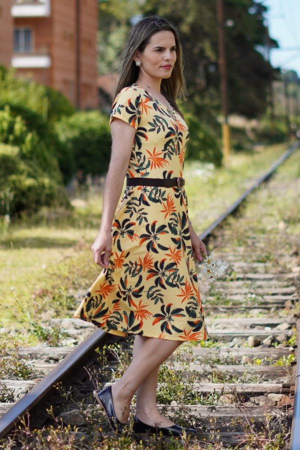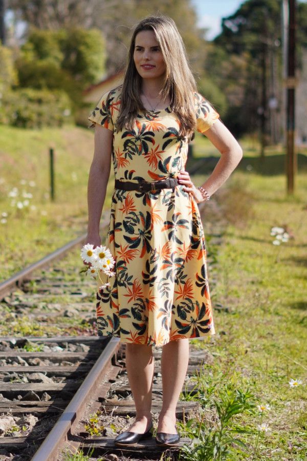 Vestido modesto midi evasê, em tecido suplex, cor amarelo, estampa floral. Possui elasticidade e está disponível nos tamanhos M, G e GG.