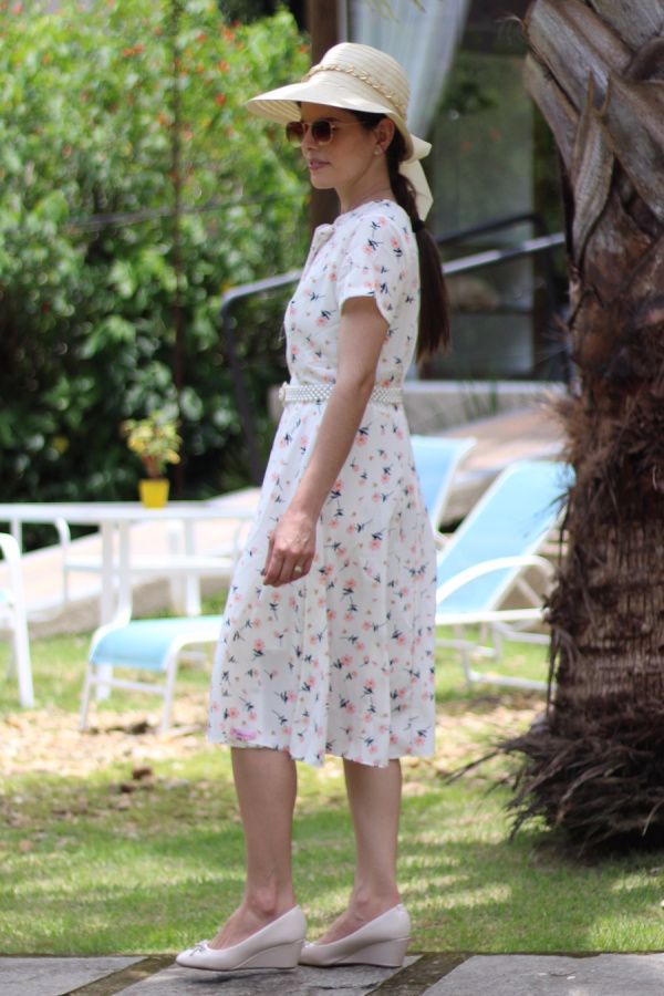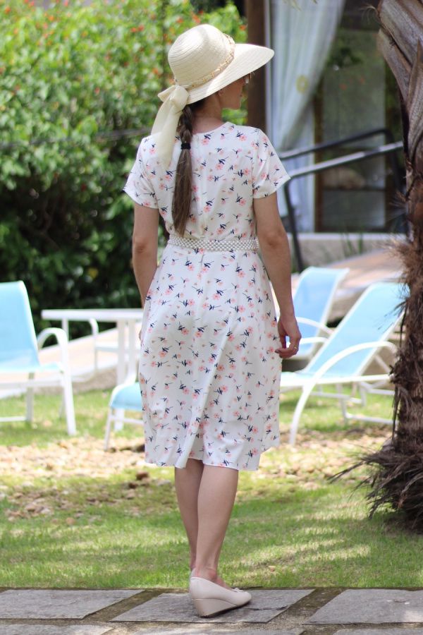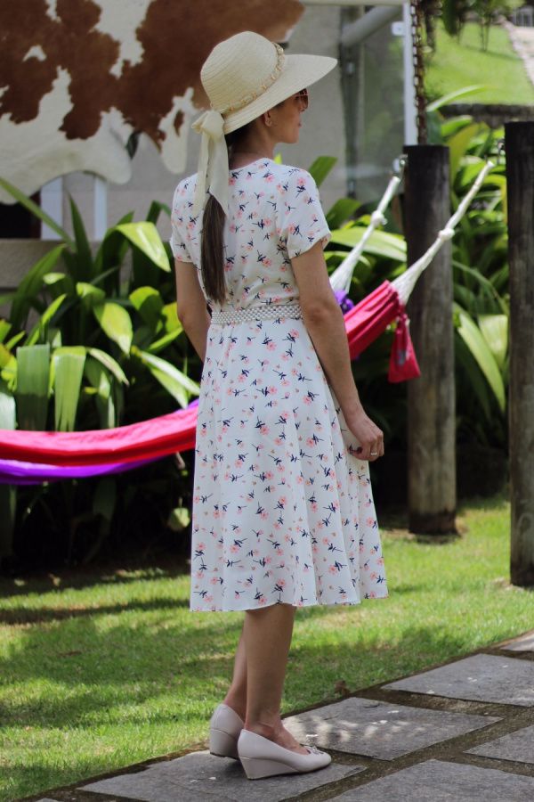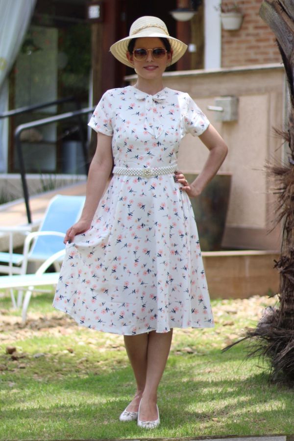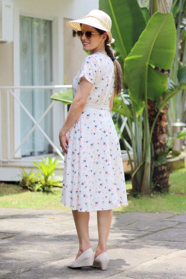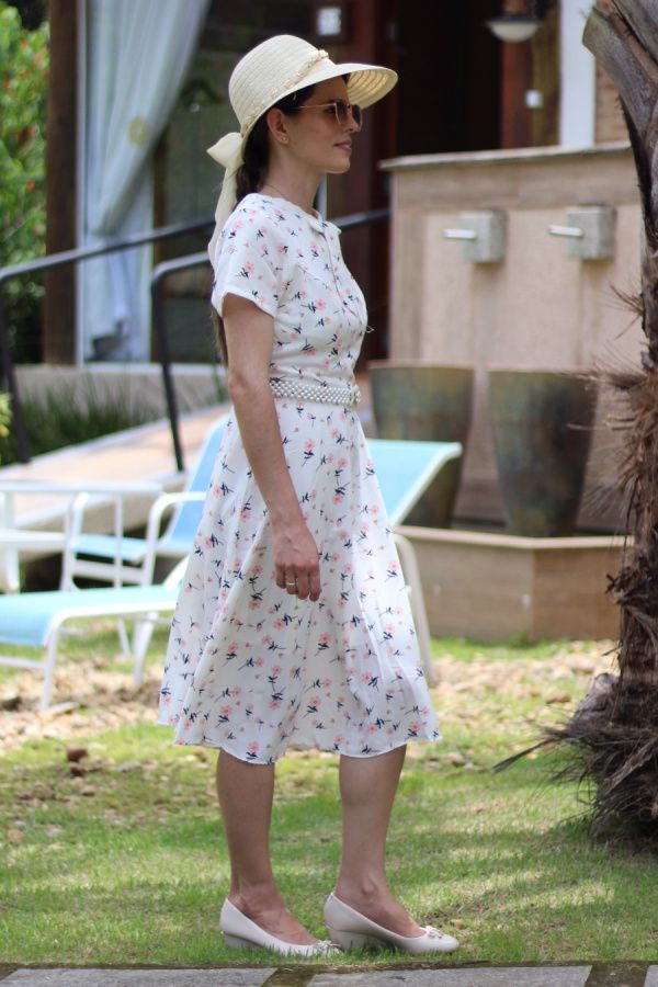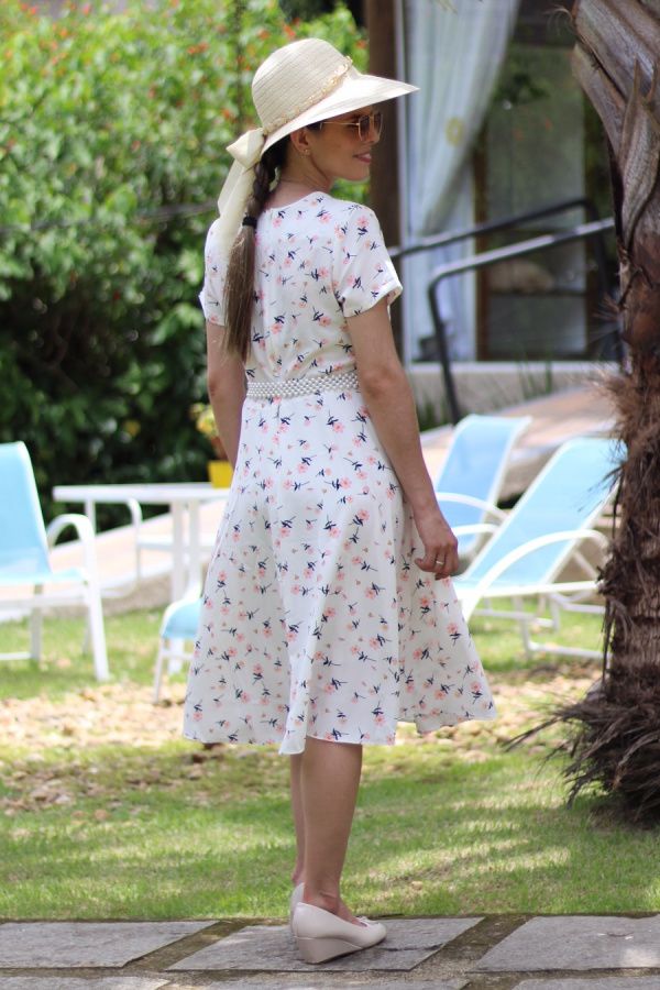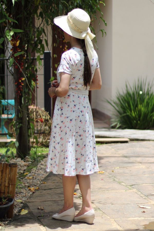 Vestido modesto midi evasê, em tecido tipo crepe, cor branca, estampa de pequenas flores. Está disponível nos tamanhos P, M e G.