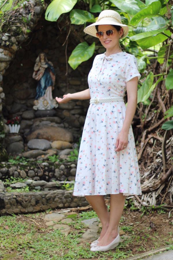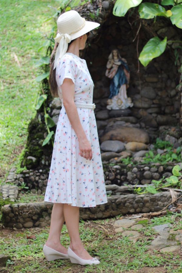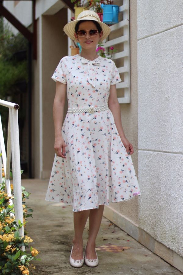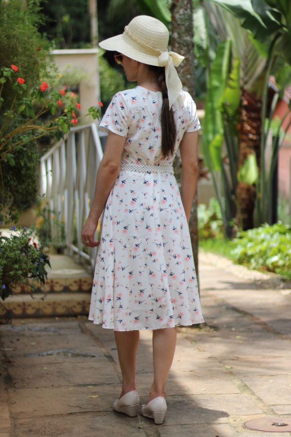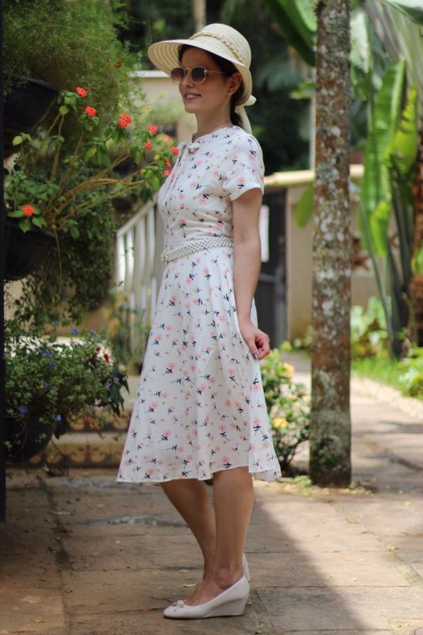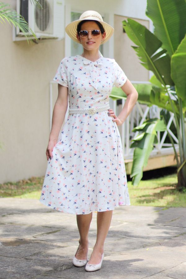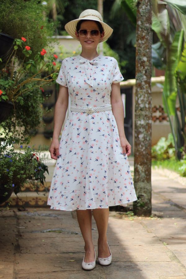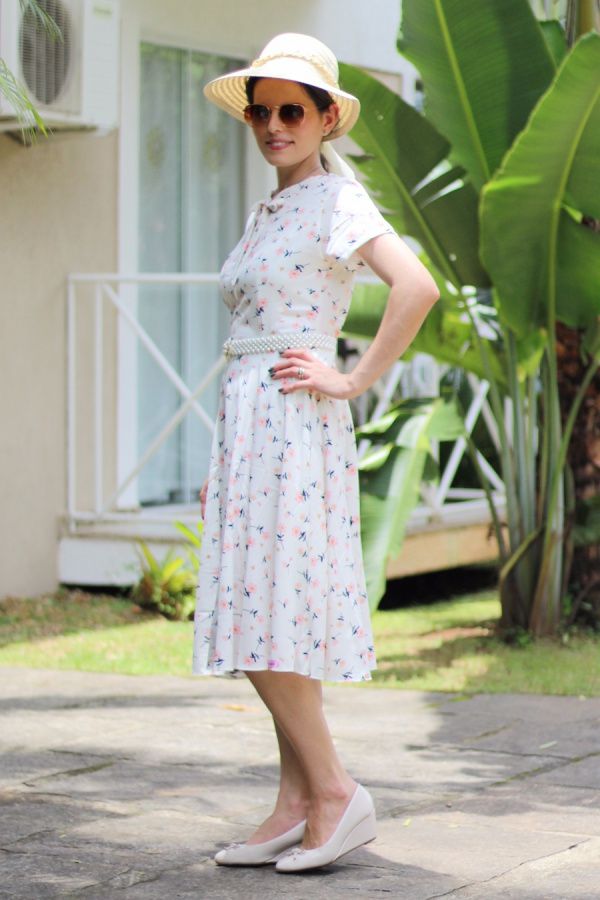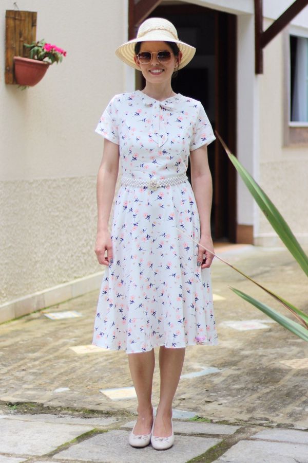 Vestido modesto midi evasê, em tecido tipo crepe, cor branca, estampa de pequenas flores. Está disponível nos tamanhos P, M e G.