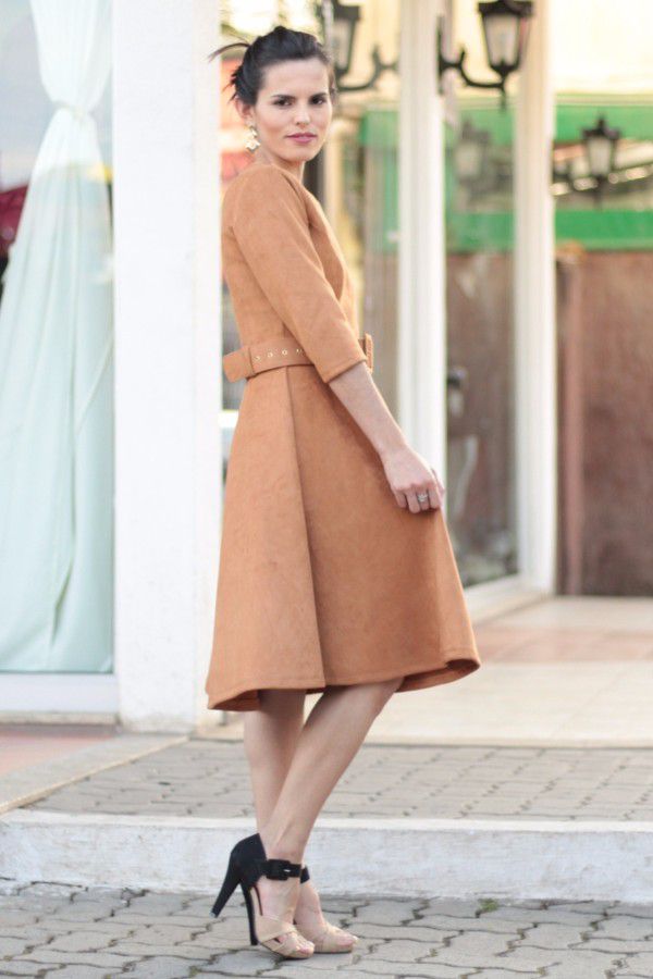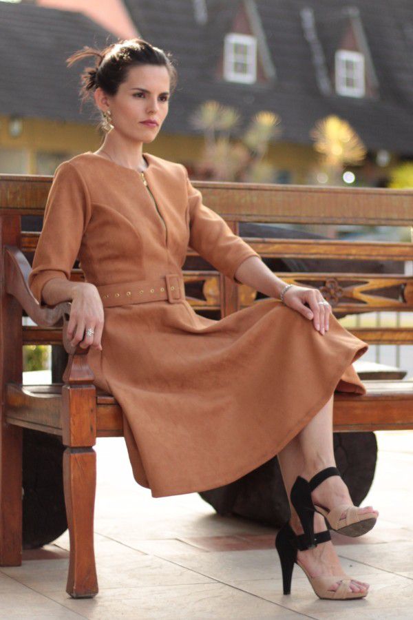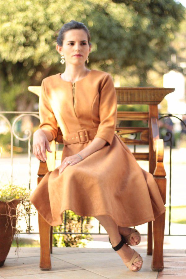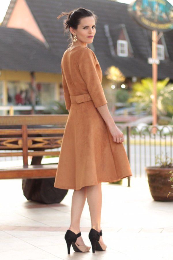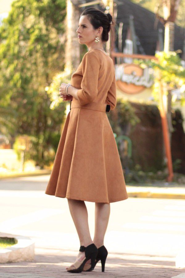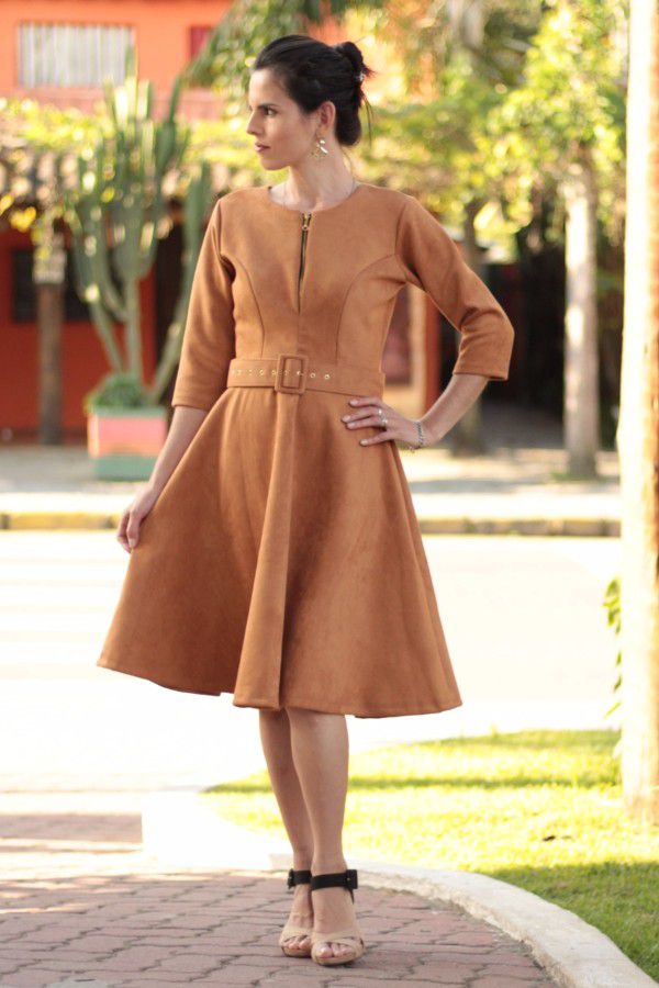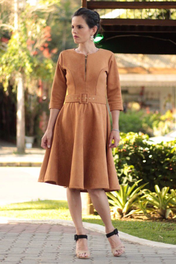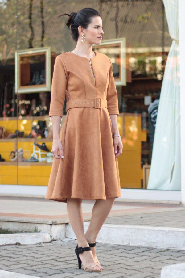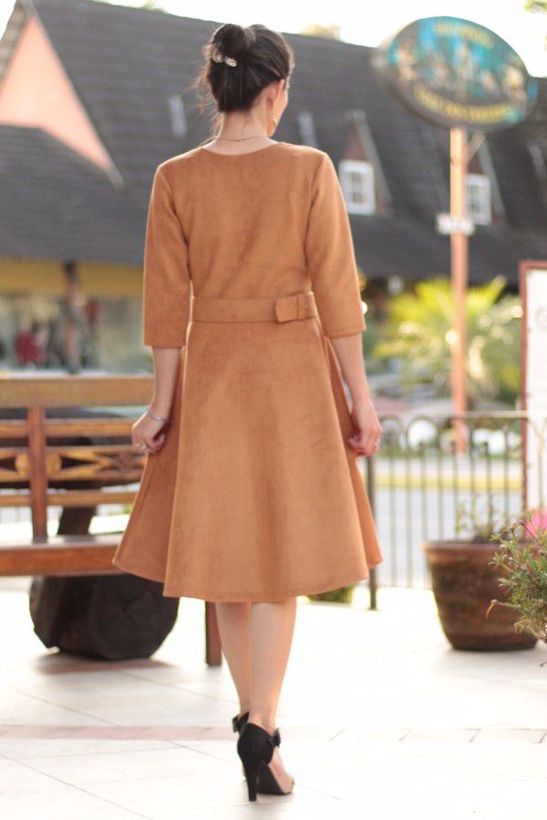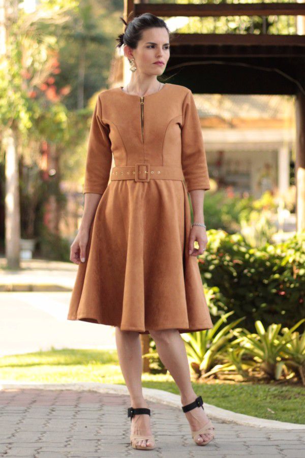 Vestido modesto midi godê, em tecido neosuede, cor marrom. Está disponível nos tamanhos P, M, G e GG.