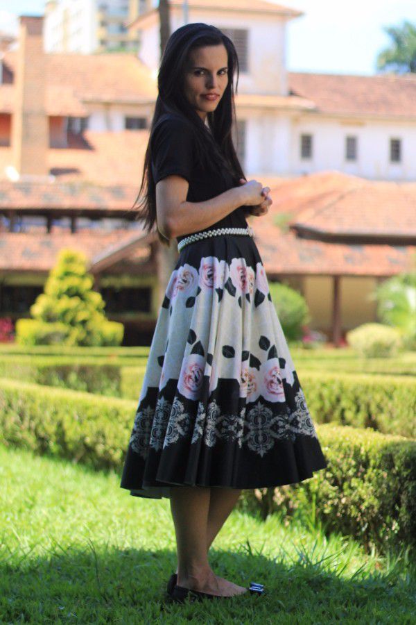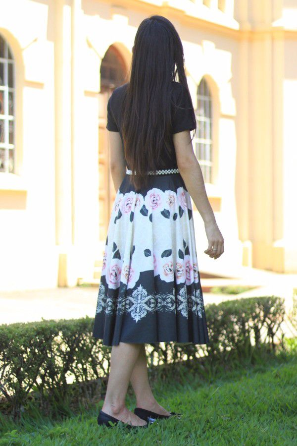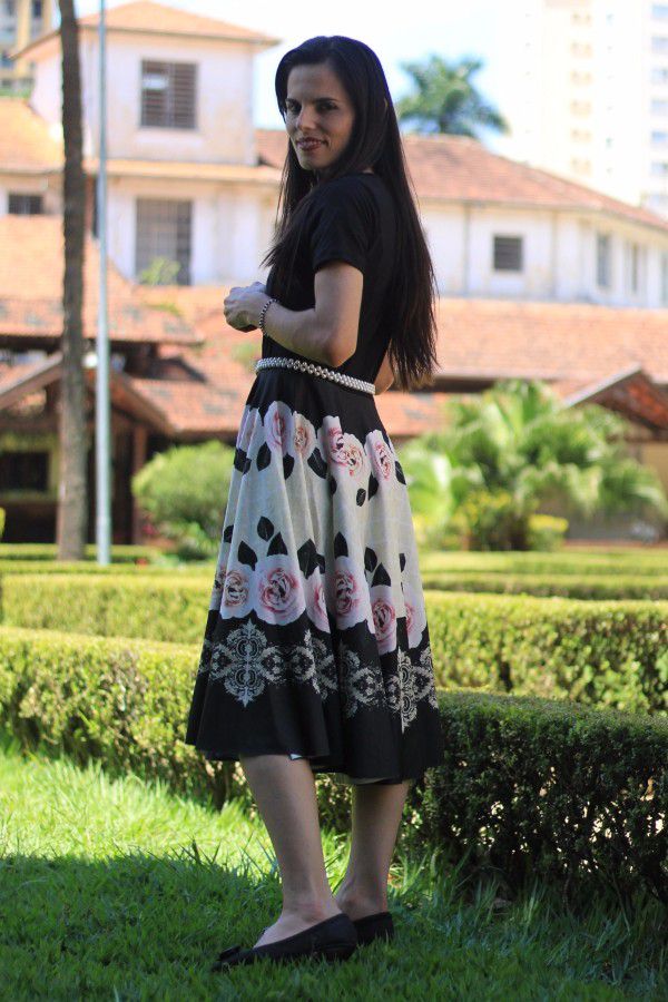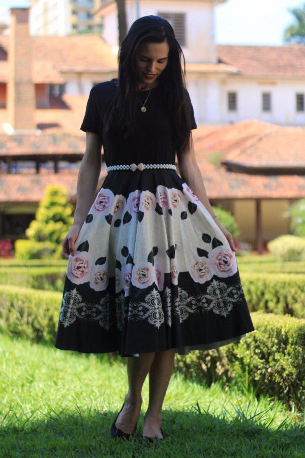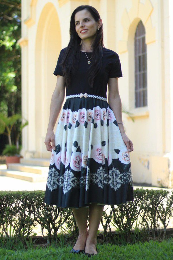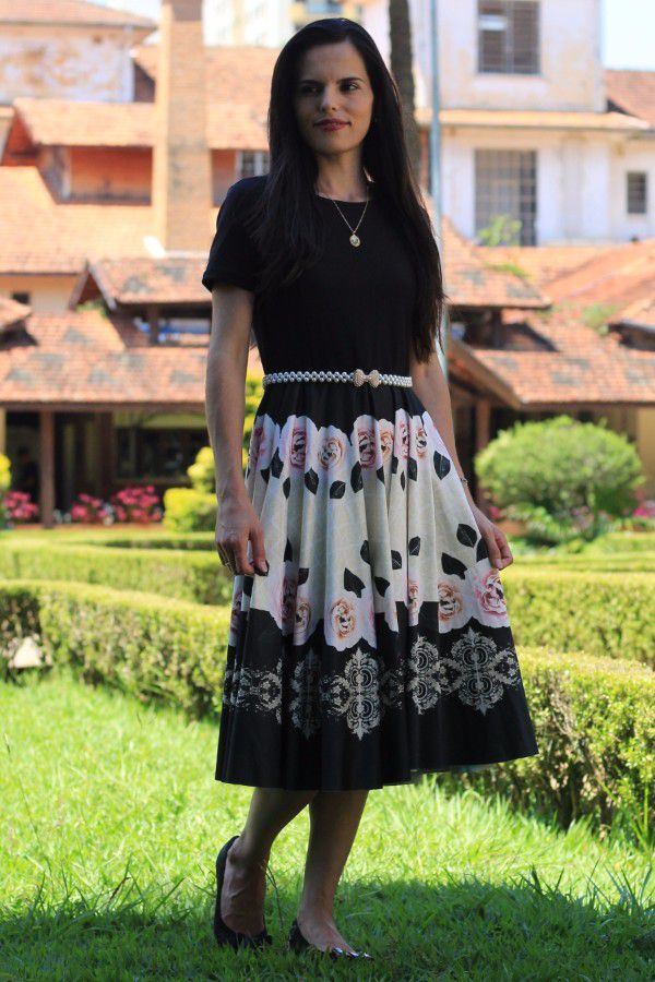 Vestido modesto midi godê total em tecido suplex, cor preto e bege com estampa digital de rosas e formas geométricas, de manga curta. Está disponível nos tamanho P e M.