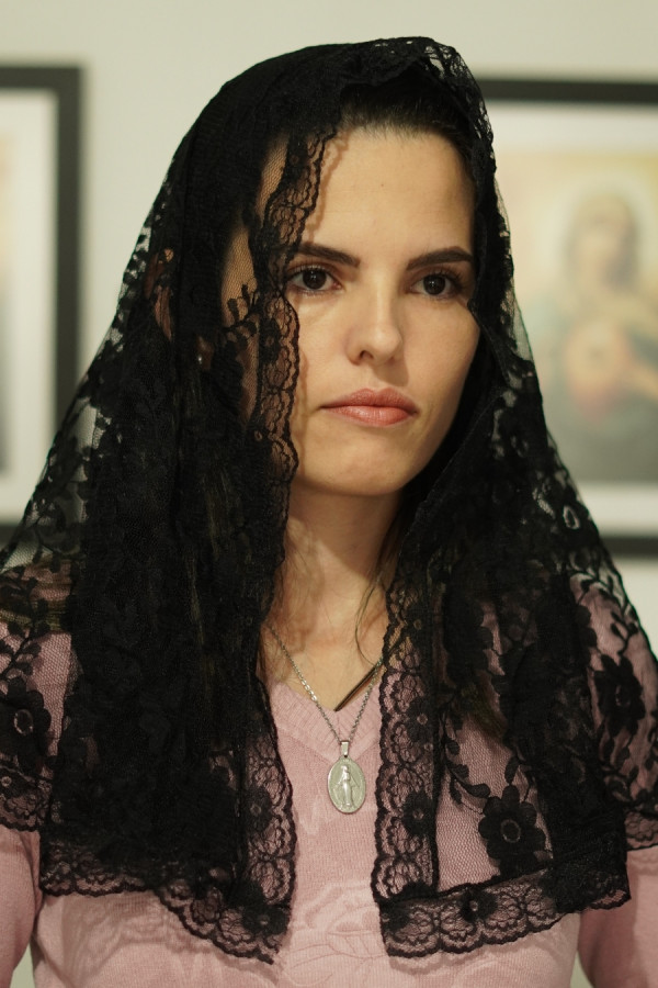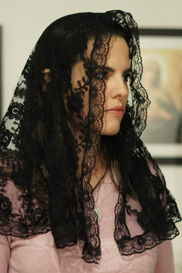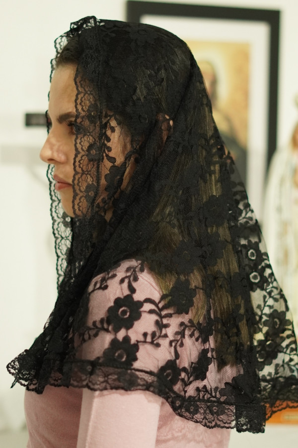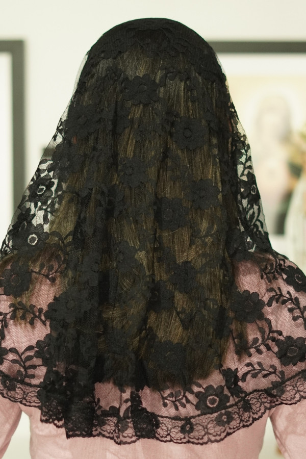 Véu médio arredondado preto para a Santa Missa, confeccionado com renda preta, textura delicada e bom caimento.