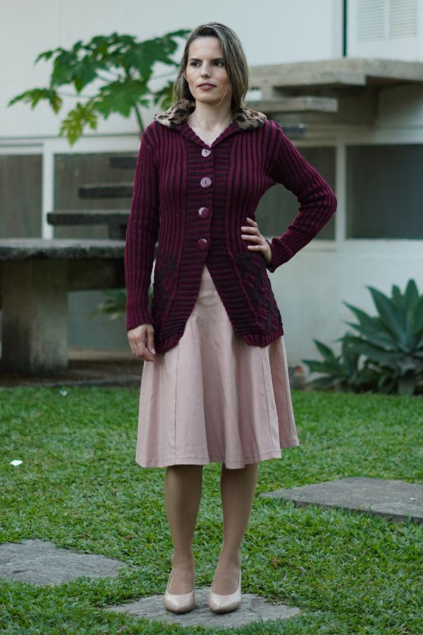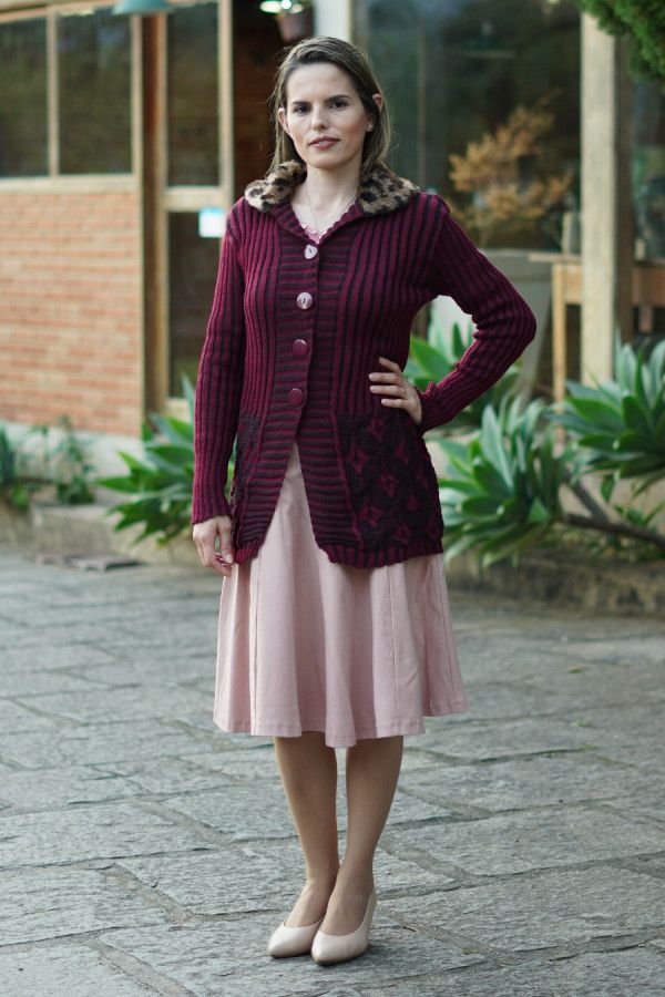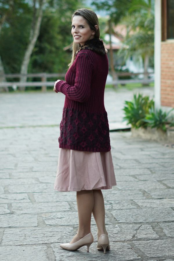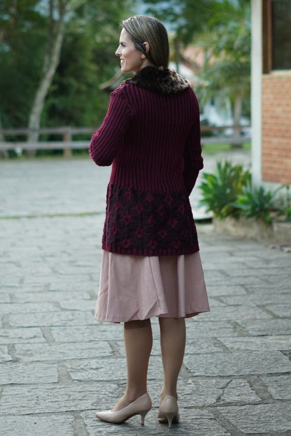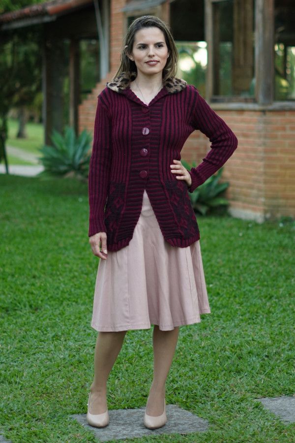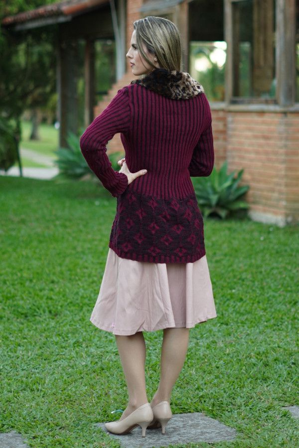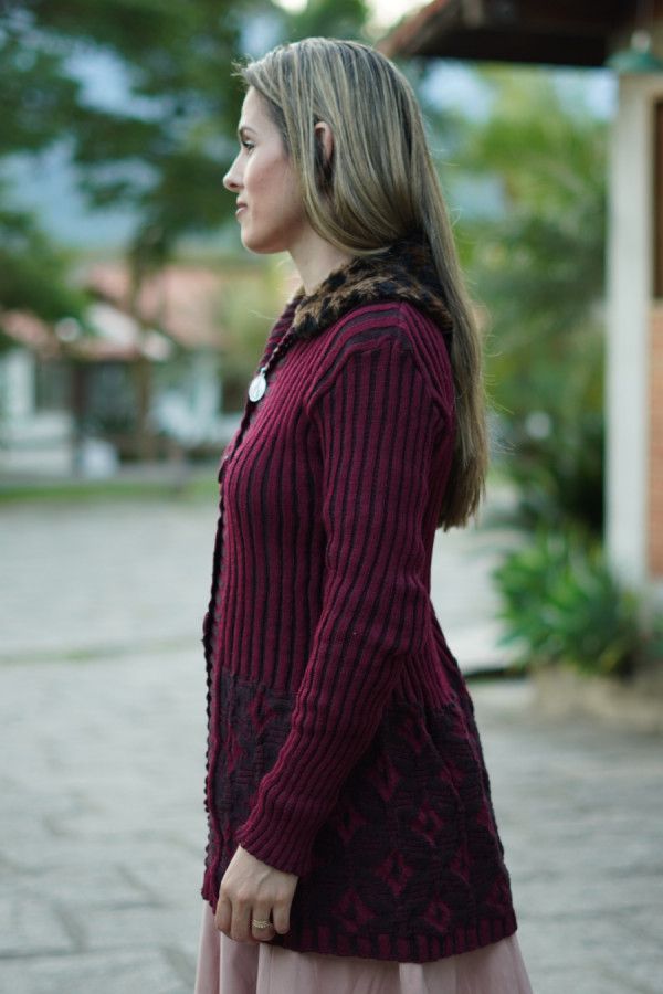 O casaco é confeccionado em tricot trama sanfonada, preto e vinho, com linda gola. Possui mangas longas, abertura frontal com botões e modelagem alongada, lindo detalhe em baixo. Combine com um vestido e bota para ficar linda e elegante no inverno.